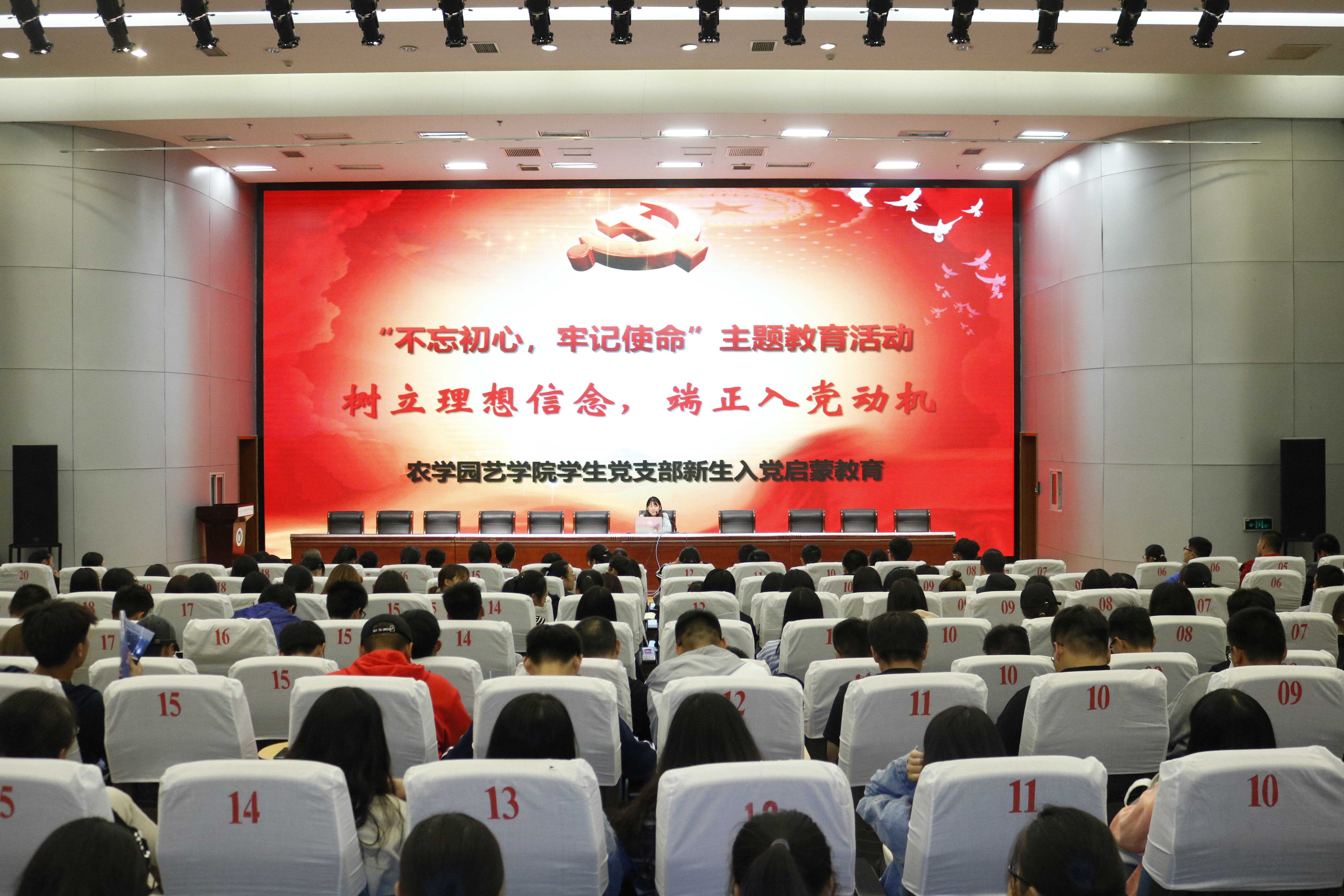 2019年10月21日,农学园艺学院学生党支部在图书馆报告厅举办了“不忘初心、牢记使命”主题教育之“树立理想信念,端正入党动机”新生入党启蒙教育专题讲座。2019级全体新生参加了讲座。本次讲座由学生党支部书记嵇怡主讲。