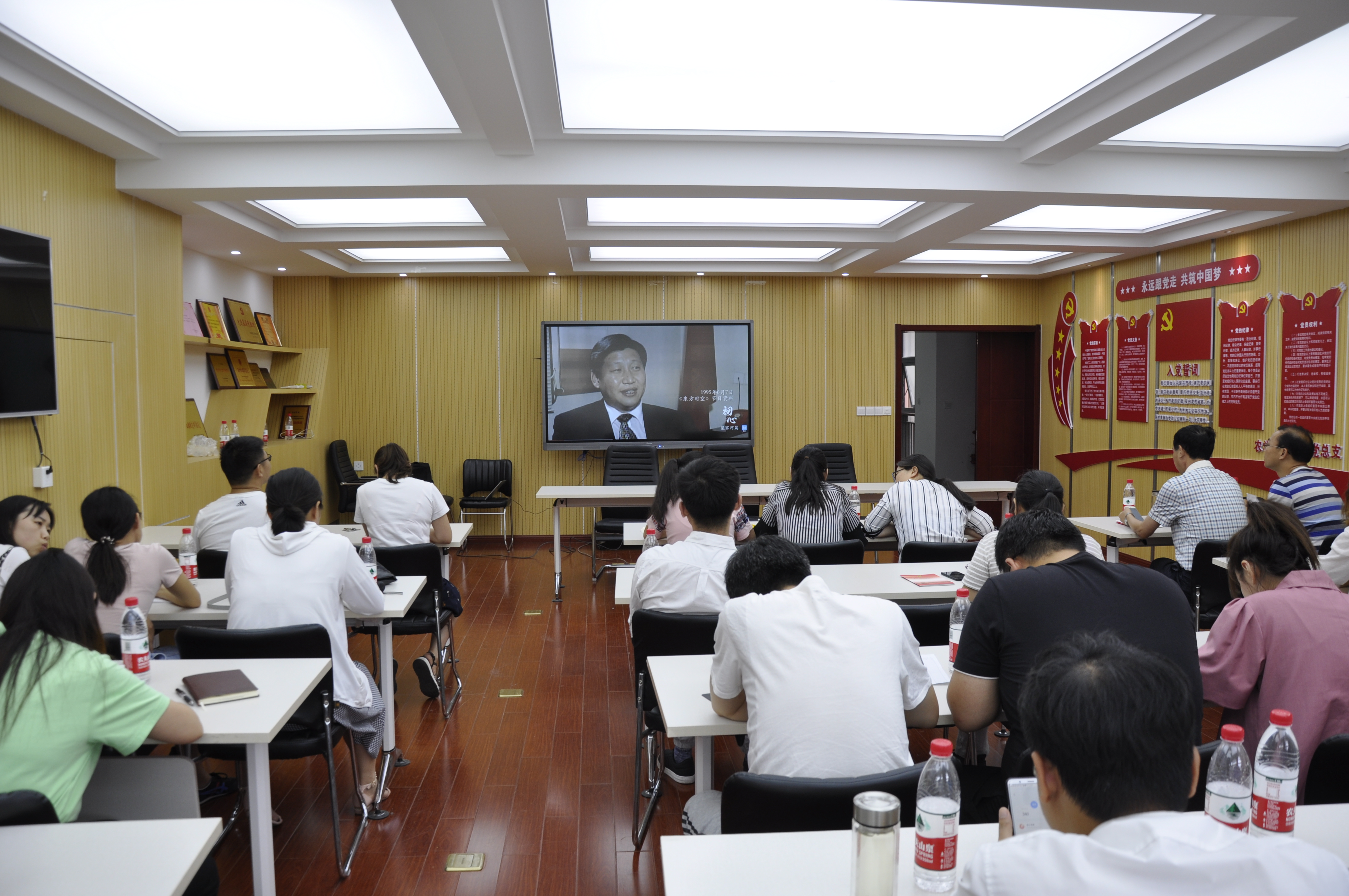 会上,杨书记首先带领全体党员集中学习了习近平总书记在“不忘初心、牢记使命”主题教育工作会议上的重要讲话精神,并重点讲解了部分“金句”。随后,与会党员一同观看学习了《勇担使命敢作为》、《追寻习近平总书记的初心·梁家河篇》。