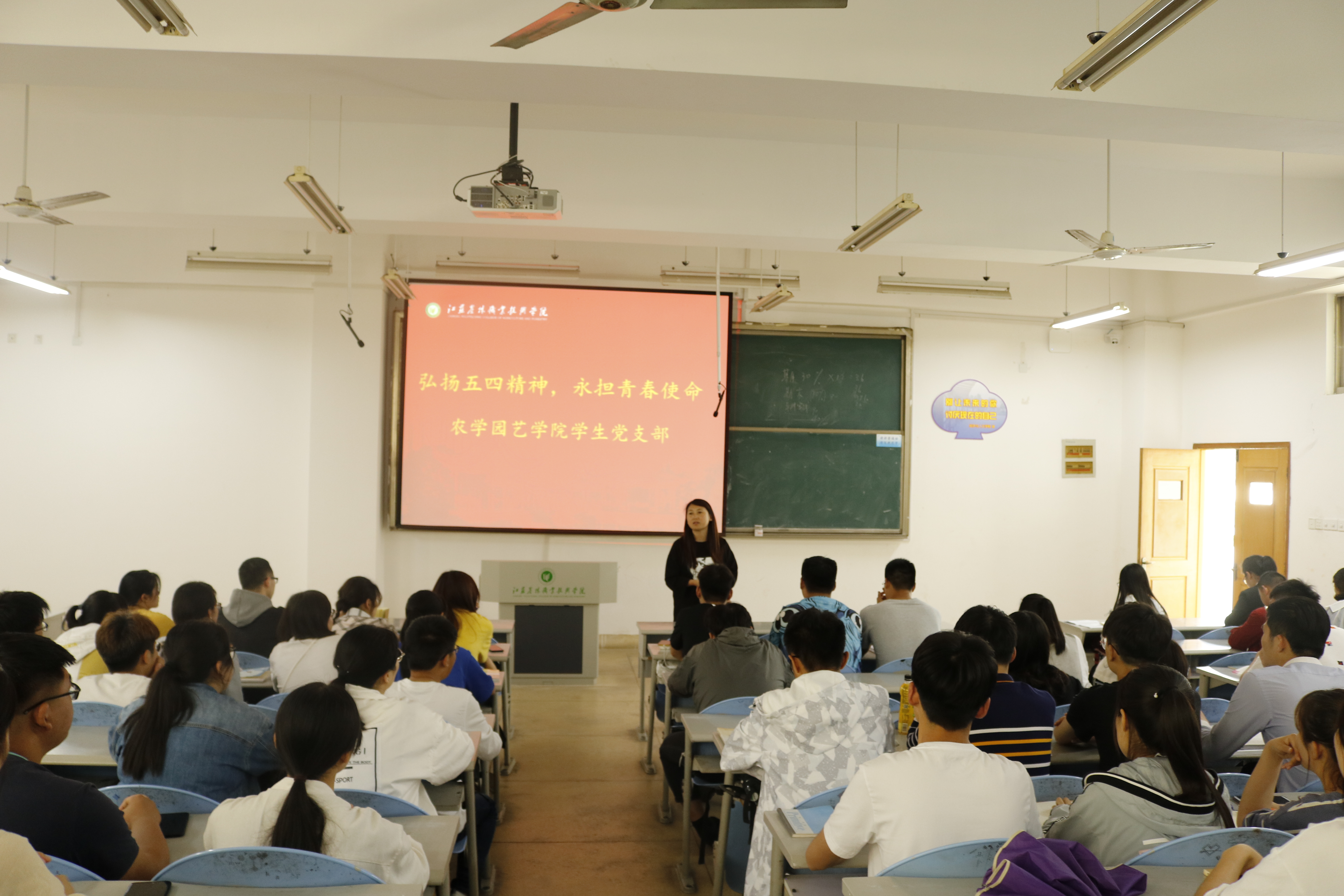 5月10日,农学园艺学院学生党支部在J1A105举行了“弘扬五四精神,永担青春使命”主题党课教育活动。党课由学生党支部书记嵇怡老师主讲,全体学生党员和部分积极分子参加了此次活动。
