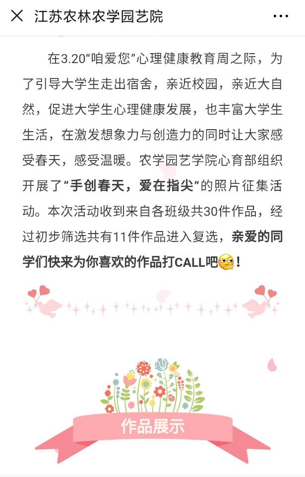 在3.20“咱爱您”心理健康教育周之际,为了引导大学生走出宿舍,亲近大自然,感受春天的生机,促进大学生心理健康发展,3月18日至28日,农学园艺学院心育部开展“手创春天,爱在指尖”创意照片活动。