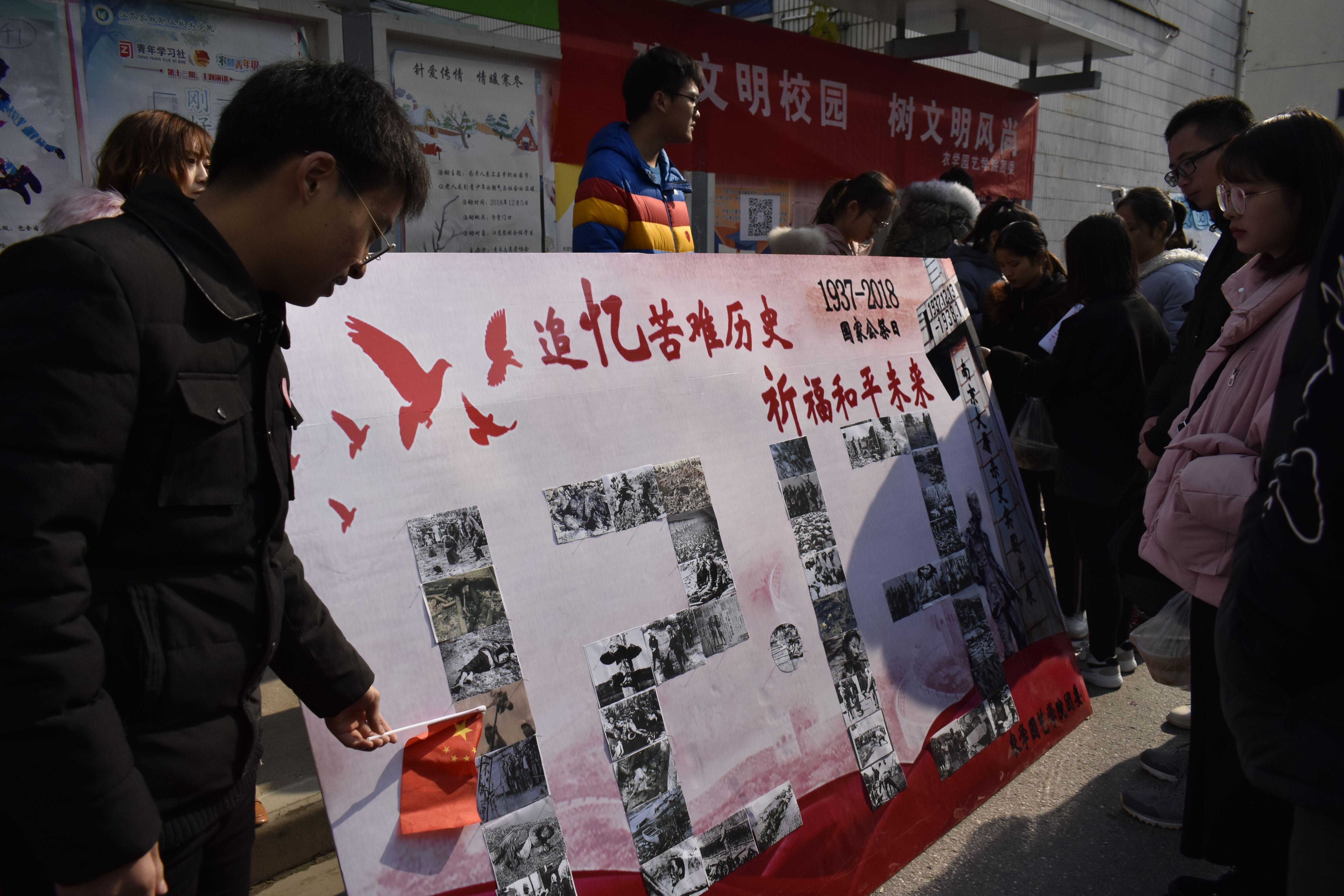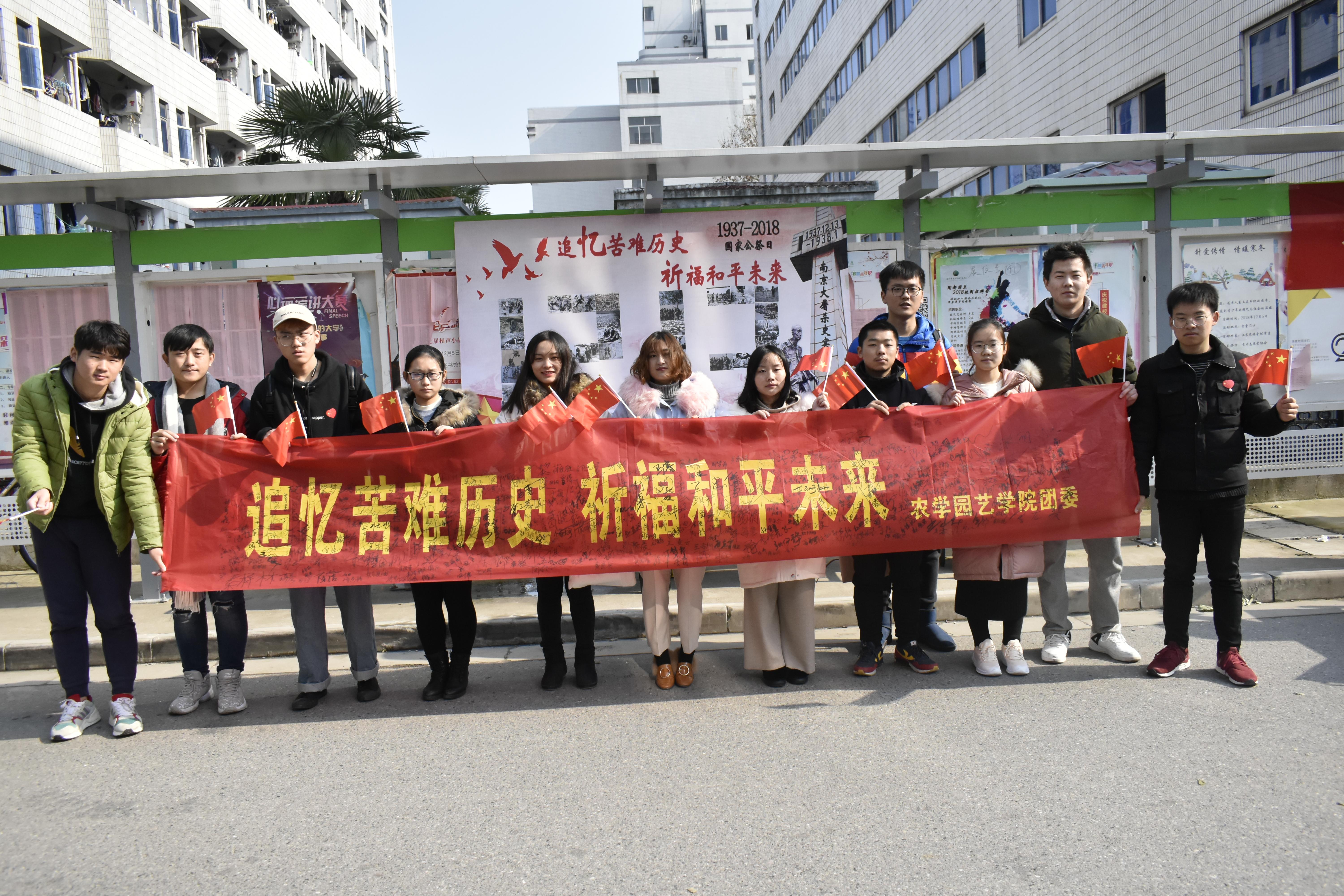 在第五个南京大屠杀死难者国家公祭日即将来临之际,为了让同学们铭记那段屈辱的历史,培养学生爱国情怀,2018年12月12日,农学园艺学院于食堂门口开展了“追忆苦难历史,祈福和平未来”南京大屠杀死难者国家公祭日纪念活动。
