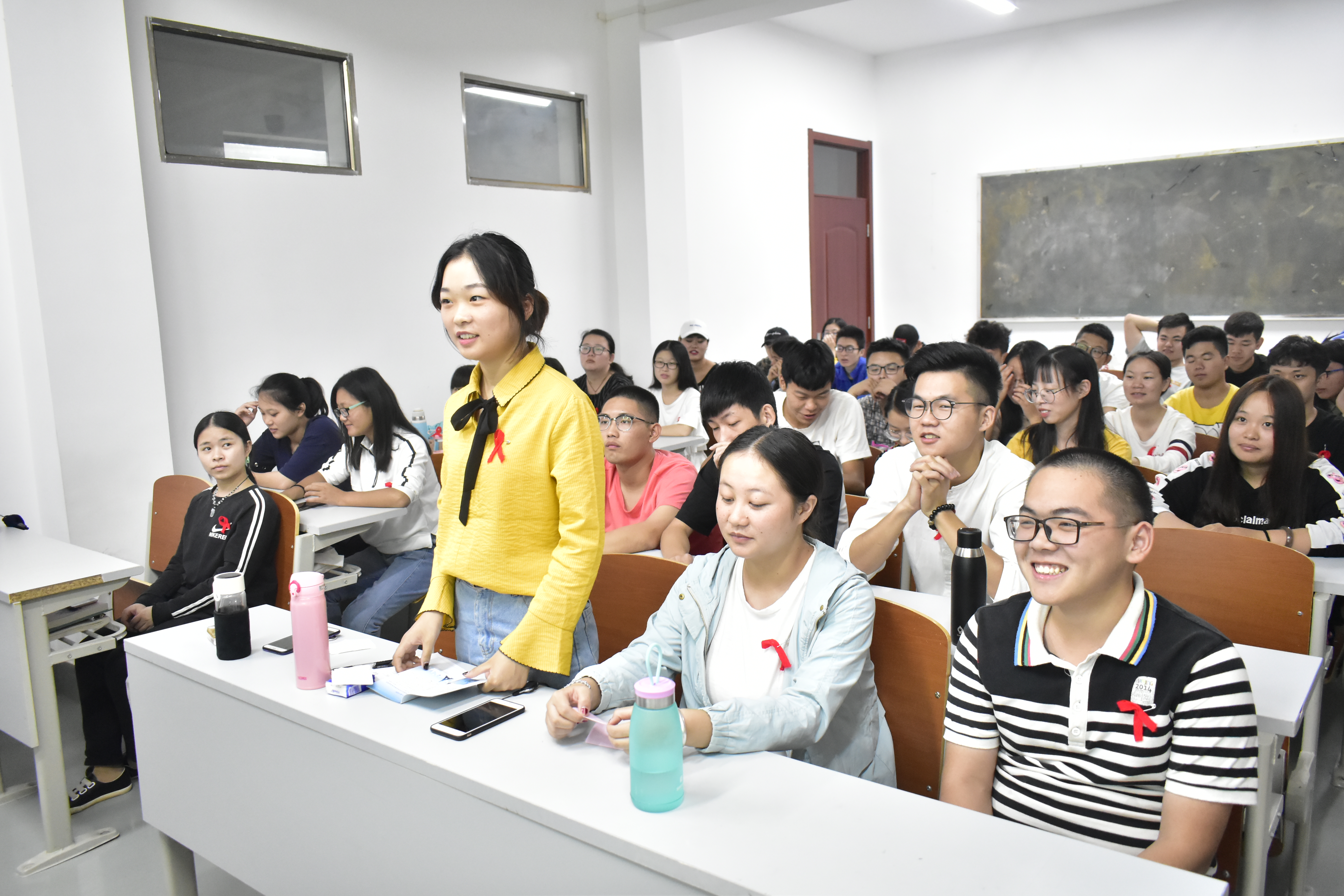 活动中,防艾同伴教育主持人通过向大家分发了红丝带,防艾宣传手册,介绍了当前社会艾滋病的传播情况,使同学们初步了解到了艾滋病的来源及主要传播方式,同时让大家意识到早孕现象在当前社会中普遍存在。他给大家观看了几组大学生意外妊娠的案例,其中的危害让在场的学生感到恐怖,大家纷纷表示,要爱护自己,要“建立一个没有意外妊娠的世界”。同学们就预防艾滋病、性病等青春健康的相关问题展开了有奖竞猜,大家积极举手踊跃作答,氛围活跃。
