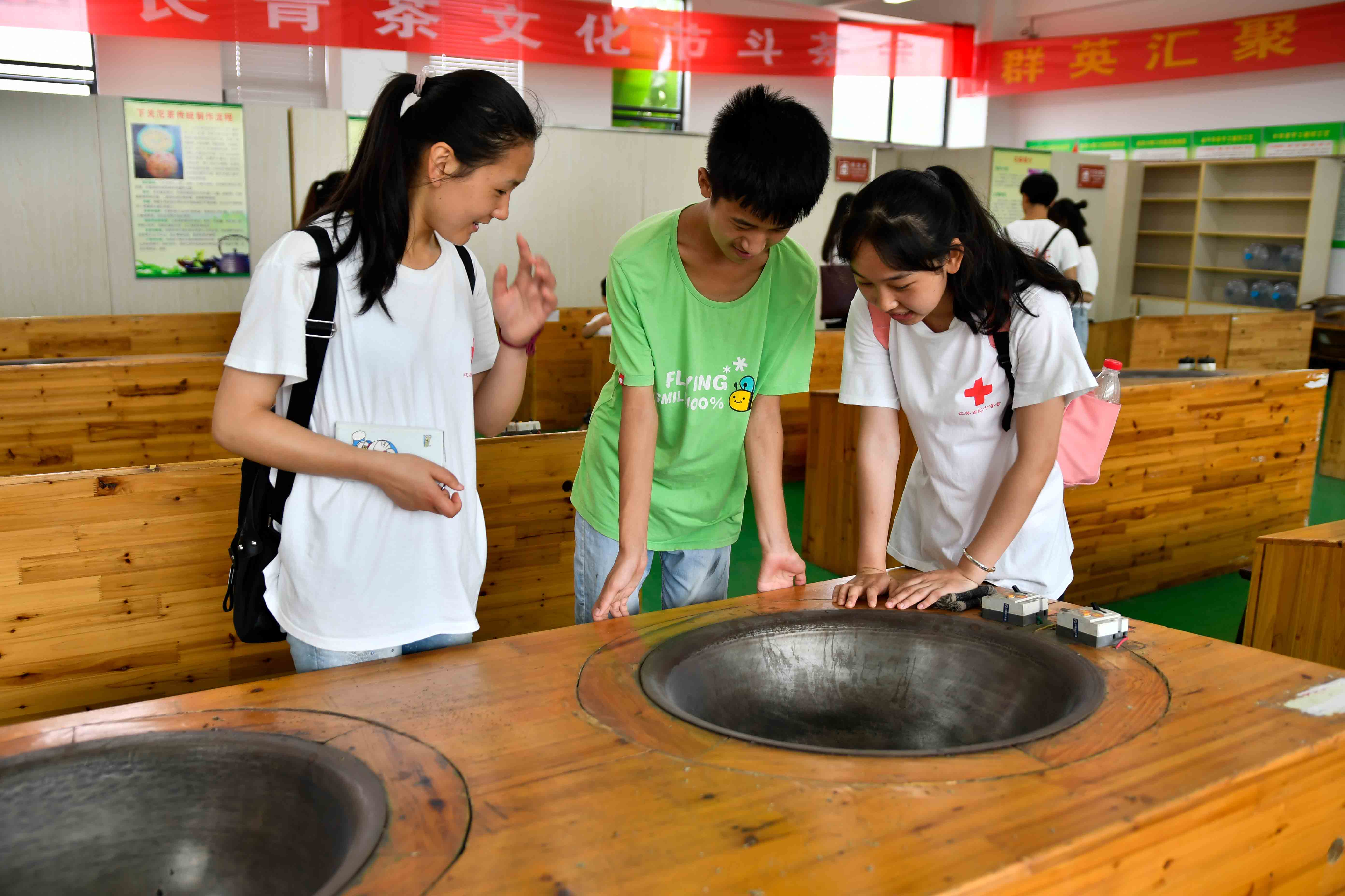 微风习习,茶香四溢,在志愿者们的陪伴下,孩子们一路欢声笑语来到国家4A级景区江苏茶博园。一行人跟随导游走在充满茶气息的大道上,看着两边墙上图文并茂,对茶的详细介绍,志愿者时而为孩子答疑解惑,时而和他们嬉戏打闹,大家一起分享着自然的美好。走到天下第一壶,精巧的设计让它巨大的体积与湖面融为一体,此等奇观让人惊叹。穿过竹廊,观赏着品种丰富茶树,园内先进的种植机械让孩子们充满好奇。跟随着潺潺流水,我们走进习茶院,看着炒茶、制茶的工具,导游详细介绍着茶叶的生产流程。来到后院我们又游览了天下第一、第二泉和各种风格的茶室,了解了品茶水与环境的重要性。