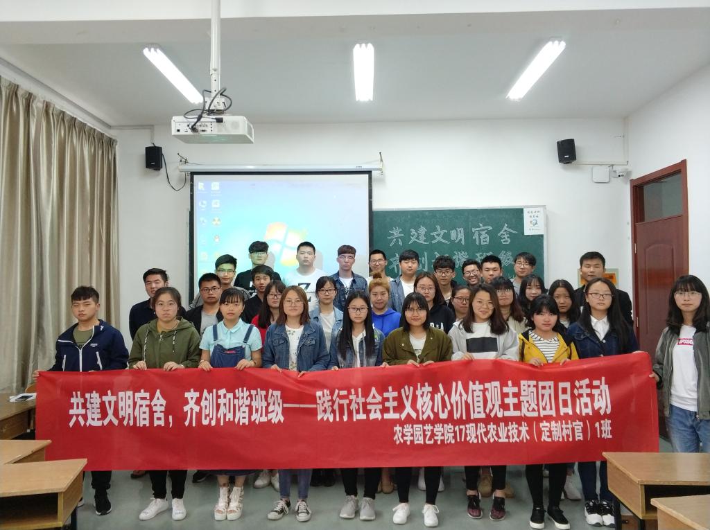 17现代农业技术(村官1)团支部以宿舍为单位,通过集体游戏和舍歌展示的方式,将社会主义核心价值观中“文明,和谐”贯彻到同学们的实际生活中。