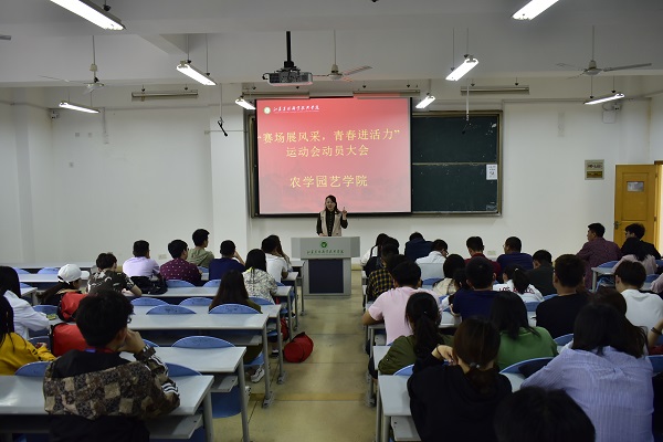 为了积极备战学校第十四届运动会,激发全院运动员为学院争光的热情,2018年4月11日下午,农学园艺学院在J1A205开展了“赛场展风采,青春迸活力”运动会动员大会。学院党委副书记董慧、团委书记嵇怡、学工办任小俊、团委学生会学生干部及所有运动员参加此次会议。