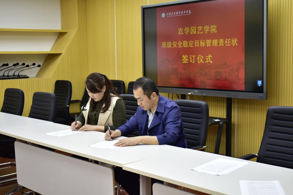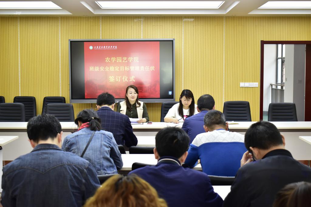 为认真贯彻学校“安全第一,预防为主”的安全工作总方针,落实学校安全防范措施,进一步明确辅导员(班主任)的安全职责及责任意识的增强,4月11日,农学园艺学院在研发楼二楼会议室举行班级安全稳定目标管理责任状签订仪式,学院党总支副书记董慧参会,并代表学院与各班主任分别签订了《江苏农林职业技术学院班级安全稳定目标管理责任状》。同时,她强调班主任们要严格维护班级安全稳定工作,一方面要加强学生人身及财产安全管理,另一方面要加强班级外出活动安全管理及毕业生的教育管理。面对突发事件,要第一时间主动到场协调,维护学生安全与利益,并及时上报上级部门领导。
