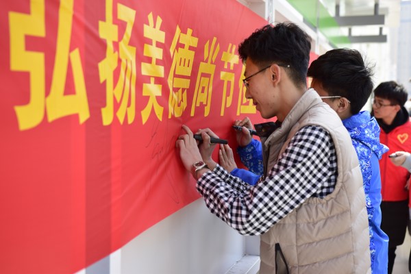 活动中,有的志愿者们在食堂门口组织来往学生认真阅读《文明就餐倡议书》,请赞同者在横幅上郑重签下自己的名字,代表着一种承诺和对雷锋精神的传承,同时听取同学们对光盘行动的有效建议,反馈给食堂;有的志愿者们则在食堂内帮助阿姨收拾残余饭菜、打扫卫生,并对大量浪费粮食的同学给予文明劝告,对积极响应“光盘行动”者则发放光荣胸贴,以示鼓励。活动最后,大家将《文明就餐倡议书》展示于食堂,希望每一位学生能够发扬勤俭节约的雷锋精神,文明就餐。