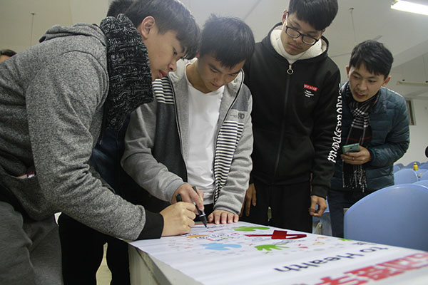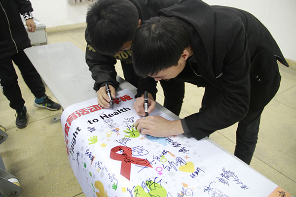 活动过程中,主持人首先分发了防艾宣传手册,并就PPT讲解了艾滋病的相关知识,从多个方面系统介绍了艾滋病的病因,传播途径和防范措施等。随后,进行了有奖问答环节,通过答题的方式使地同学们更好的了解了关于艾滋病的相关知识。同学们也准备充分,认真答题,积极参与其中,刘澜,陈正宇,段鹏东,吴鑫等同学最终脱颖而出,收获奖品。最后,在主持人的组织下,全体同学进行了遏制艾滋病签字仪式,也为艾滋病患者写下自己祝福的话语。