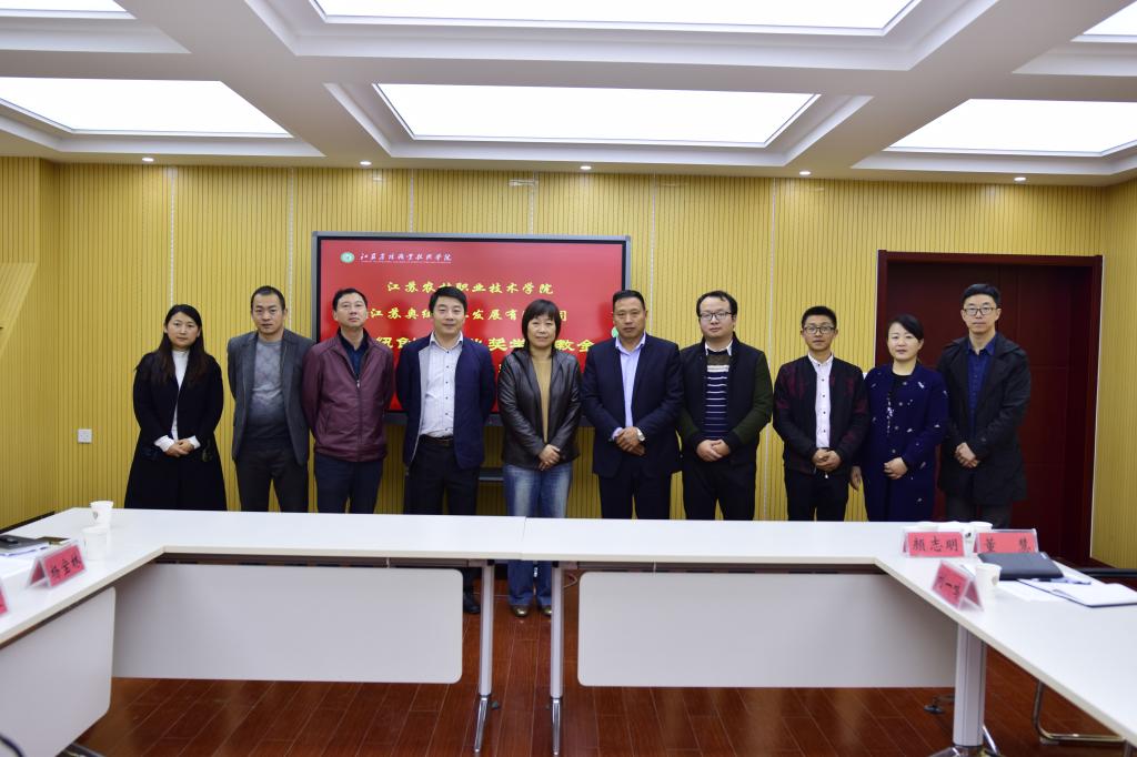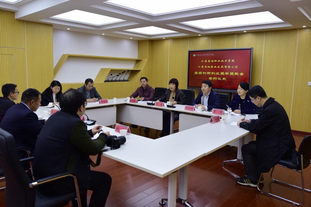 11月15日下午,我校“奥纽创新创业奖学奖教金”签约仪式在研发楼二楼会议室隆重举行,学校副校长贾君、江苏奥纽农业发展有限公司总经理蒋欣、学院院长颜志明及学院相关部门负责人出席了签约仪式。