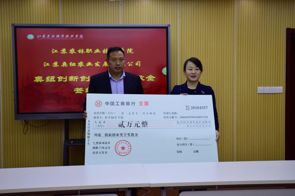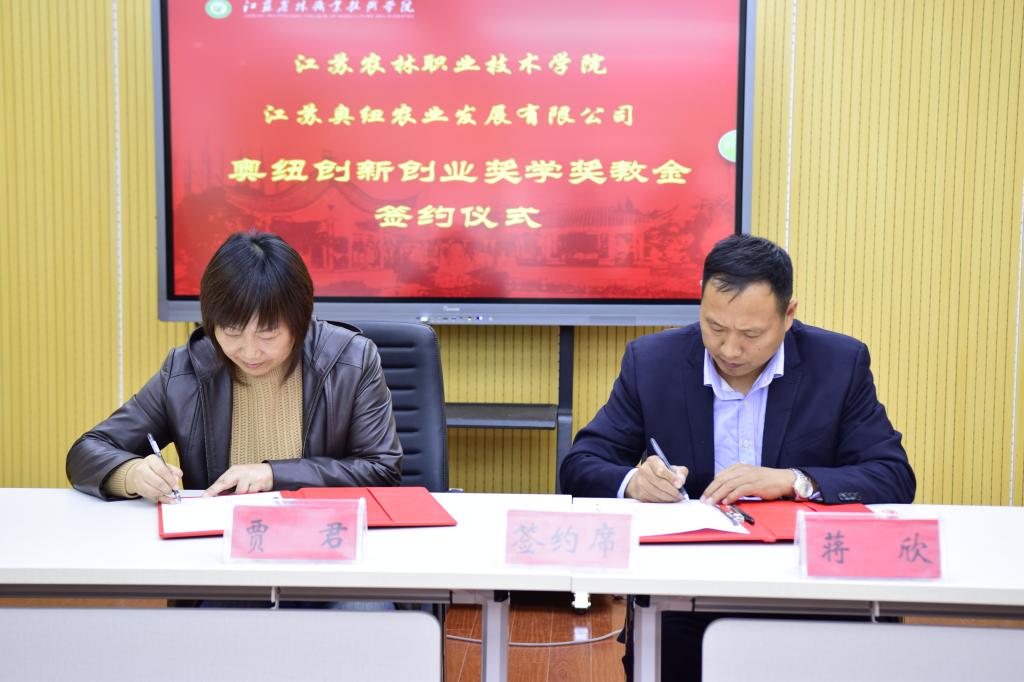 会上,贾君副校长对学校目前的总体发展概况进行了简要介绍,希望通过“奥纽创新创业奖学奖教金”的设立,在两三年内培养出创新创业领域的优质人才,达到为企业造血的目的,也能在学生发展生涯中起到积极有效的作用。蒋欣总经理介绍了江苏奥纽农业发展有限公司概况以及“奥纽创新创业奖学奖教金”设立的宗旨,希望达到合作共赢、互建互利、合作发展的目的。随后,双方正式签订了合作协议。仪式结束之后,来访客人还参观了我院江苏农博园。