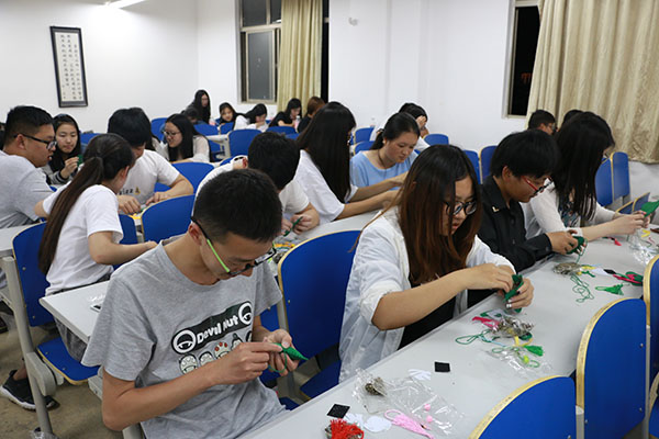端午临中夏,时清日复长。学子颂诗词,经典且传扬。此次活动分三个环节进行,在诗词接龙中,同学们信心满满,只待一争高下,主持人也是妙语连珠,题目百出,你出上联,我对下联,你诵诗篇,我答作者,节目好生热闹。诗词连连看中,同学们也是思维敏捷,对答如流,亲友团们更是热情鼓励,打气加油,将活动推向高潮。手工香包的缝制,则展示了女生们的心灵手巧,穿针引线,纤手巧弄,一只只精美的香包便呈现出来,浓浓的佳节氛围蕴满活动现场。