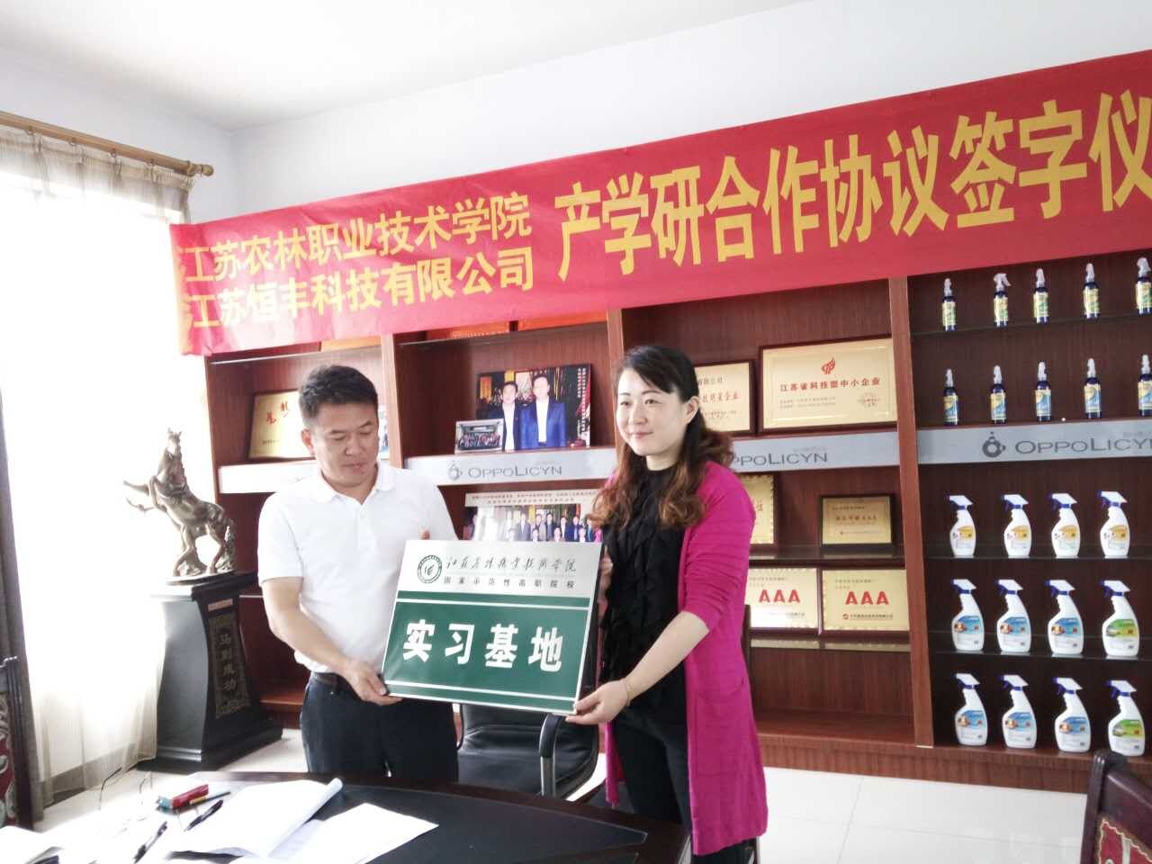 江苏恒丰科技有限公司是2012年末与台湾仁维国际股份有限公司技术合作创立的科技环保型企业。公司专注于综合微生物菌种培殖、菌剂研发、推广和应用、水土有机改良、治理等领域的工程项目。苏进总经理首先介绍了公司的生产销售情况。并陪同参观了公司生产车间。随后,双方就校企合作事宜展开洽谈,并签订了合作协议,举行了校外实习基地授牌仪式。