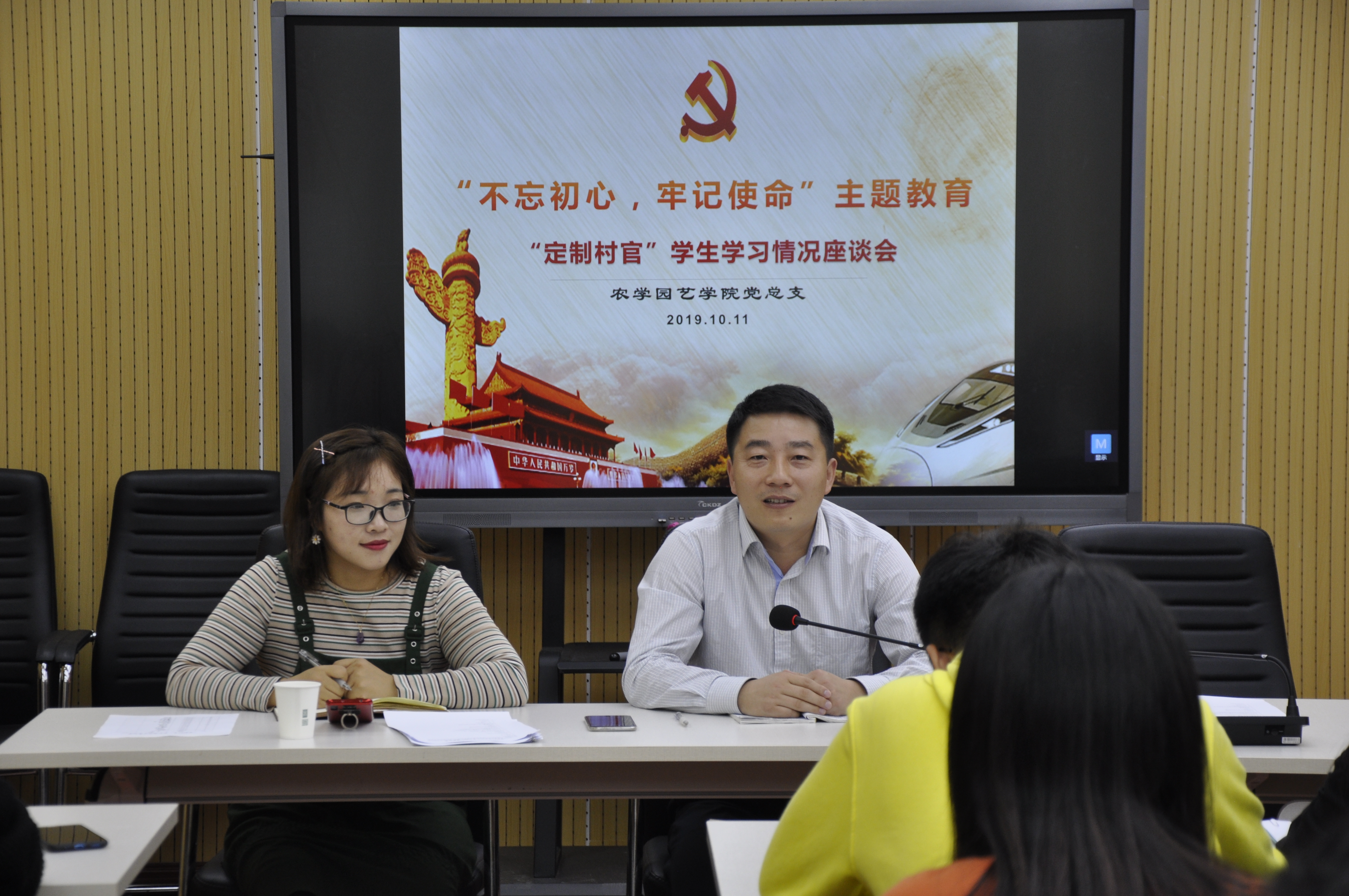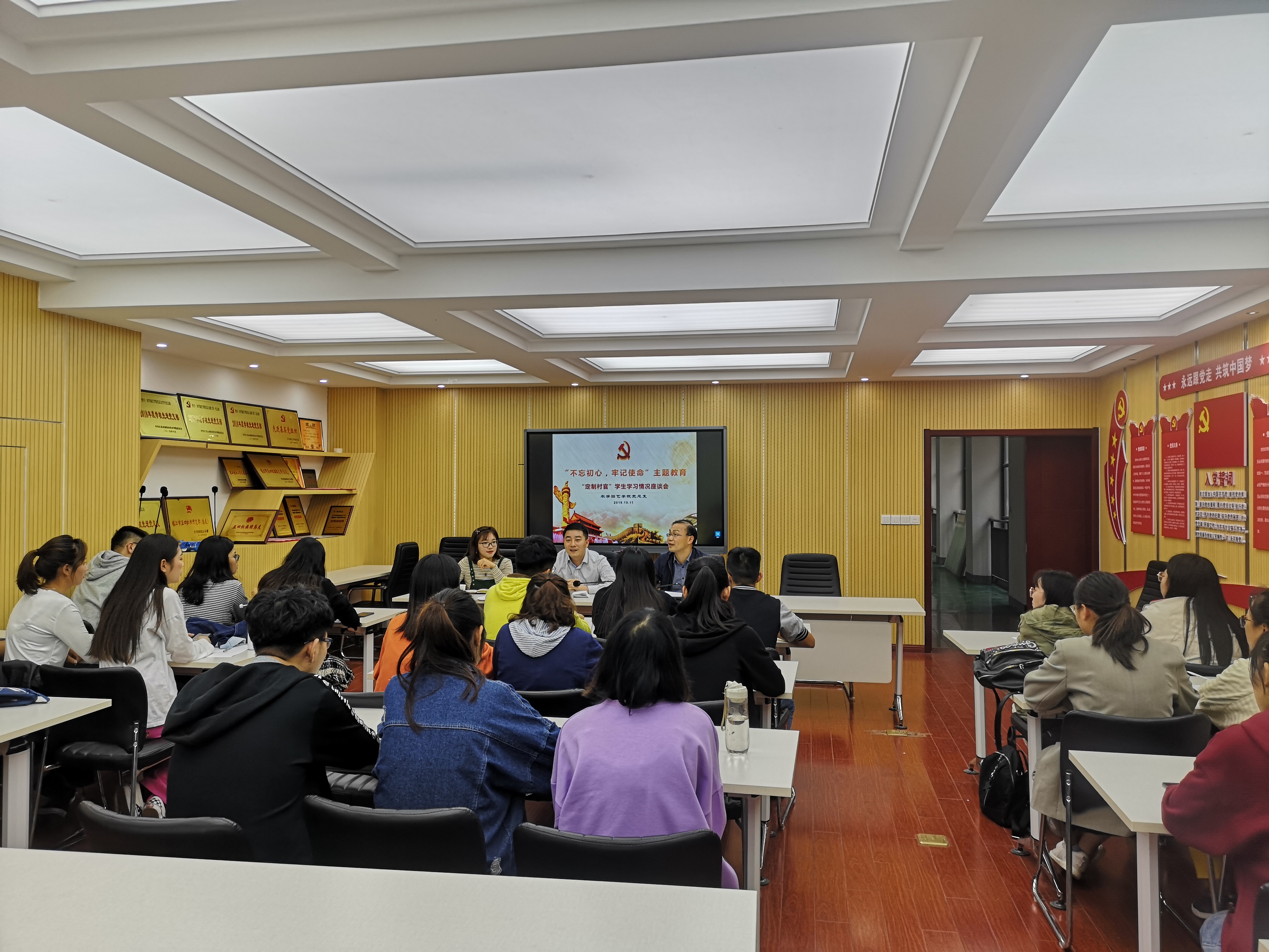 为掌握我院定制村官班的学习状况,了解同学们在学习中的困惑和期待,分析学生学习的主动性和面临的困难,探讨村官班学习特点与规律,推动村官班的学风建设,增强学生的使命感和责任感,2019年10月11日下午,农学园艺学院在研发楼院会议室举办“不忘初心、牢记使命”主题教育——“定制村官”学生学习情况调研座谈会。出席活动的有农学园艺学院党总支副书记、院长颜志明、党总支副书记王全智、教工第二党支部书记赵艳岭和2017、2018、2019级“定制村官”学生代表30名。