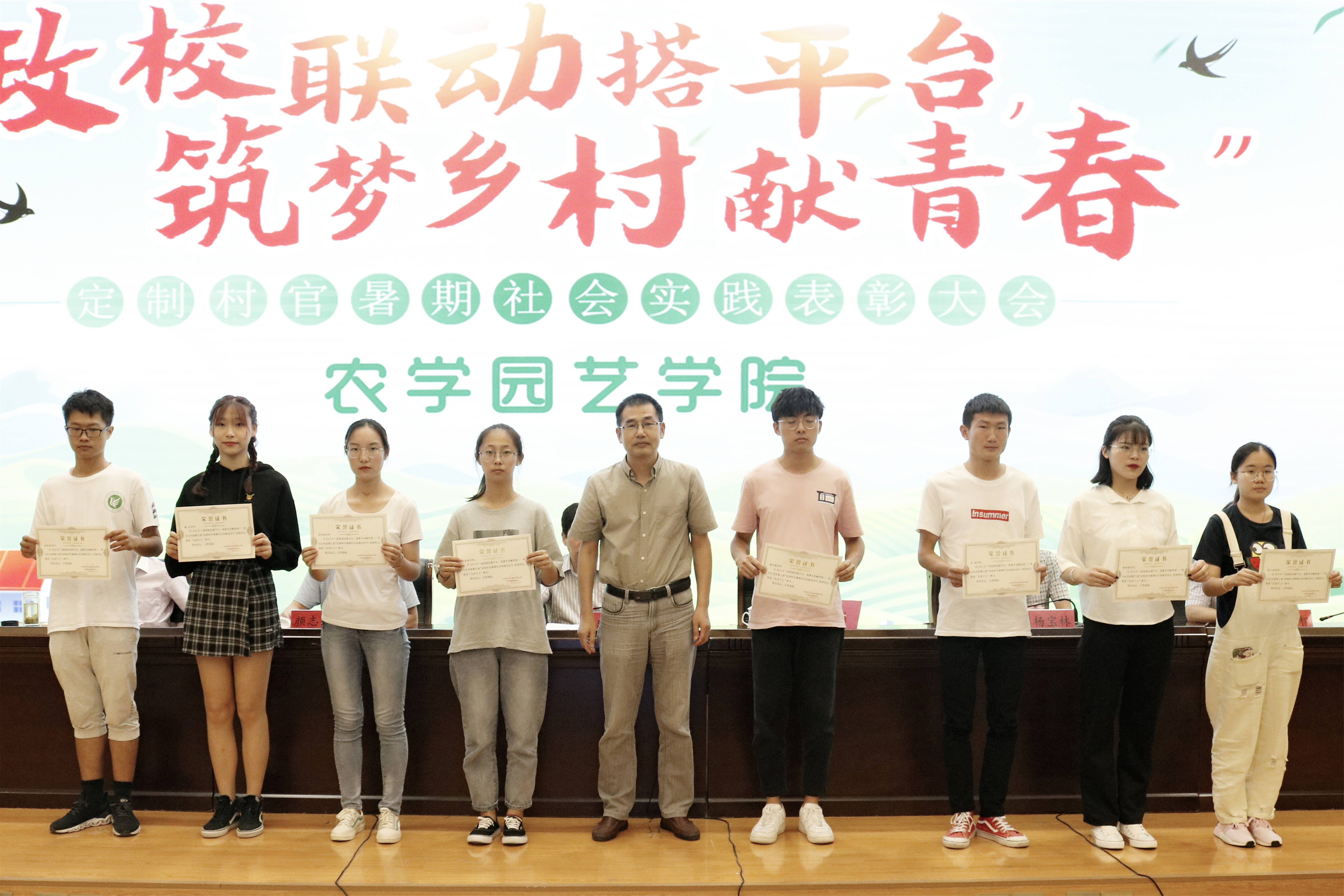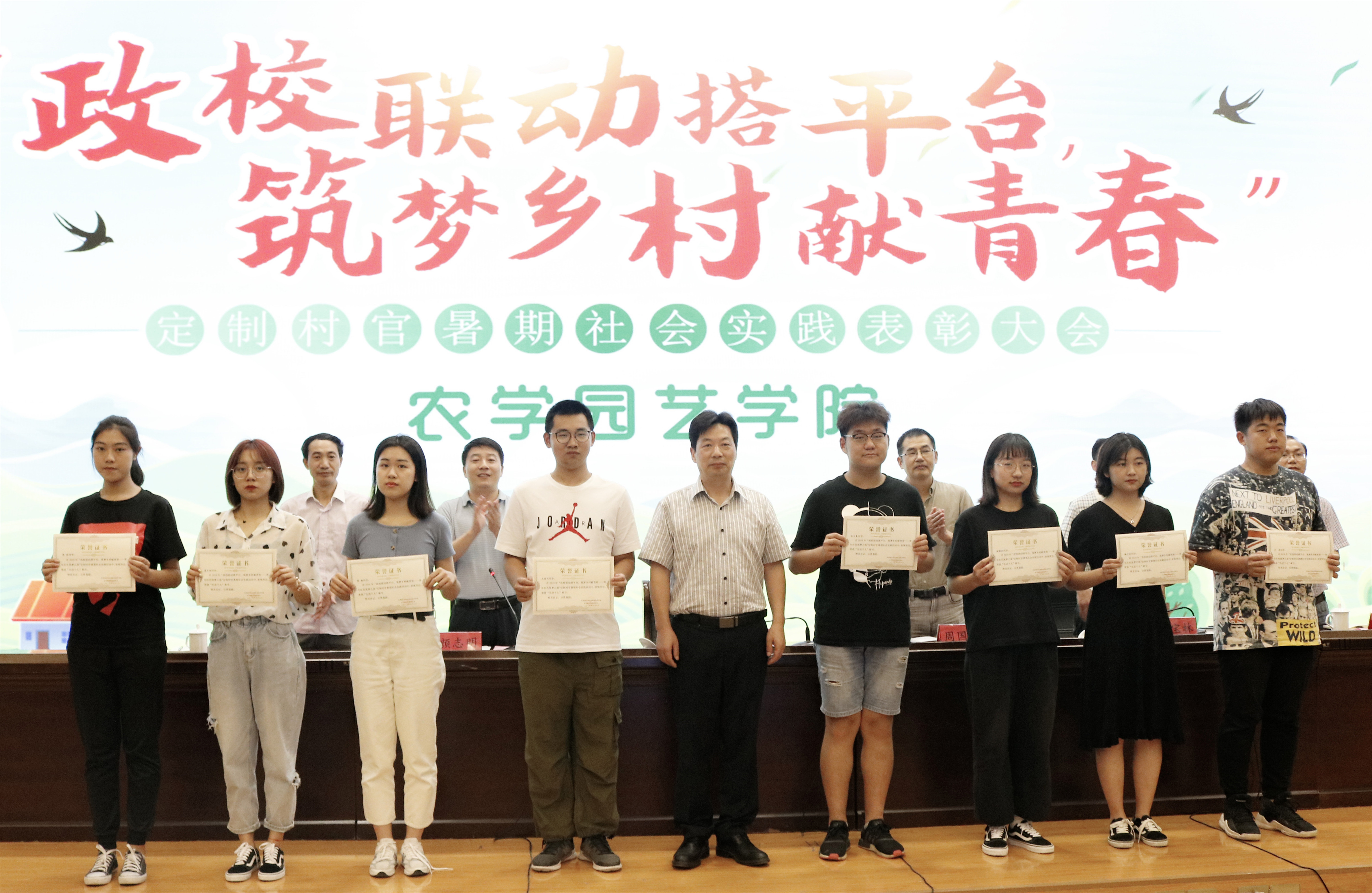 会议伊始,农学园艺学院党总支副书记王全智向大家介绍了此次 “政校联动搭平台,筑梦乡村献青春”定制村官暑期社会实践活动的开展情况,农学园艺学院党总支书记杨宝林宣读《关于表彰2019年度定制村官暑期社会实践工作优秀宣传员、先进个人、优秀团队的通报》,决定表彰平书杰等36名同学为暑期社会实践先进个人、李康睿等15名同学为暑期社会实践优秀宣传员、溧阳等8个团队为暑期社会实践优秀团队。定制村官班学生金同济和陈秋浩分别代表先进个人和优秀团队作了发言。