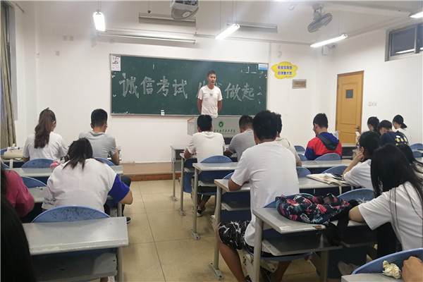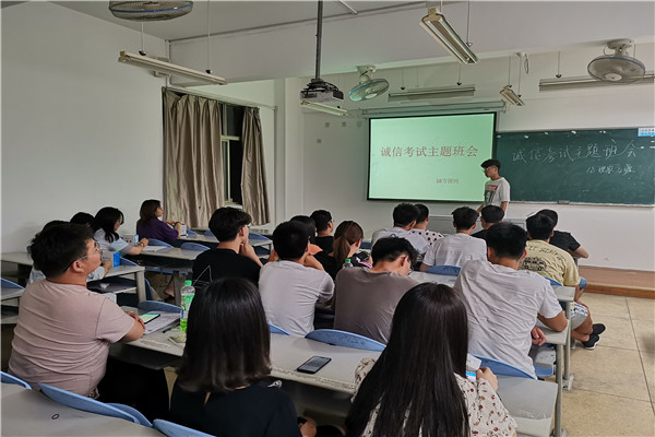 各班级班长或团支书在班会上向同学们讲解了考试作弊的不良后果及影响。考试作弊践踏了诚信理念,使得有些人投机取巧,影响同学学习的积极性,干扰了良好学风的形成。各班运用PPT、视频等形式呼吁大家诚实做人,诚信考试,努力营造公平公正的考试环境。