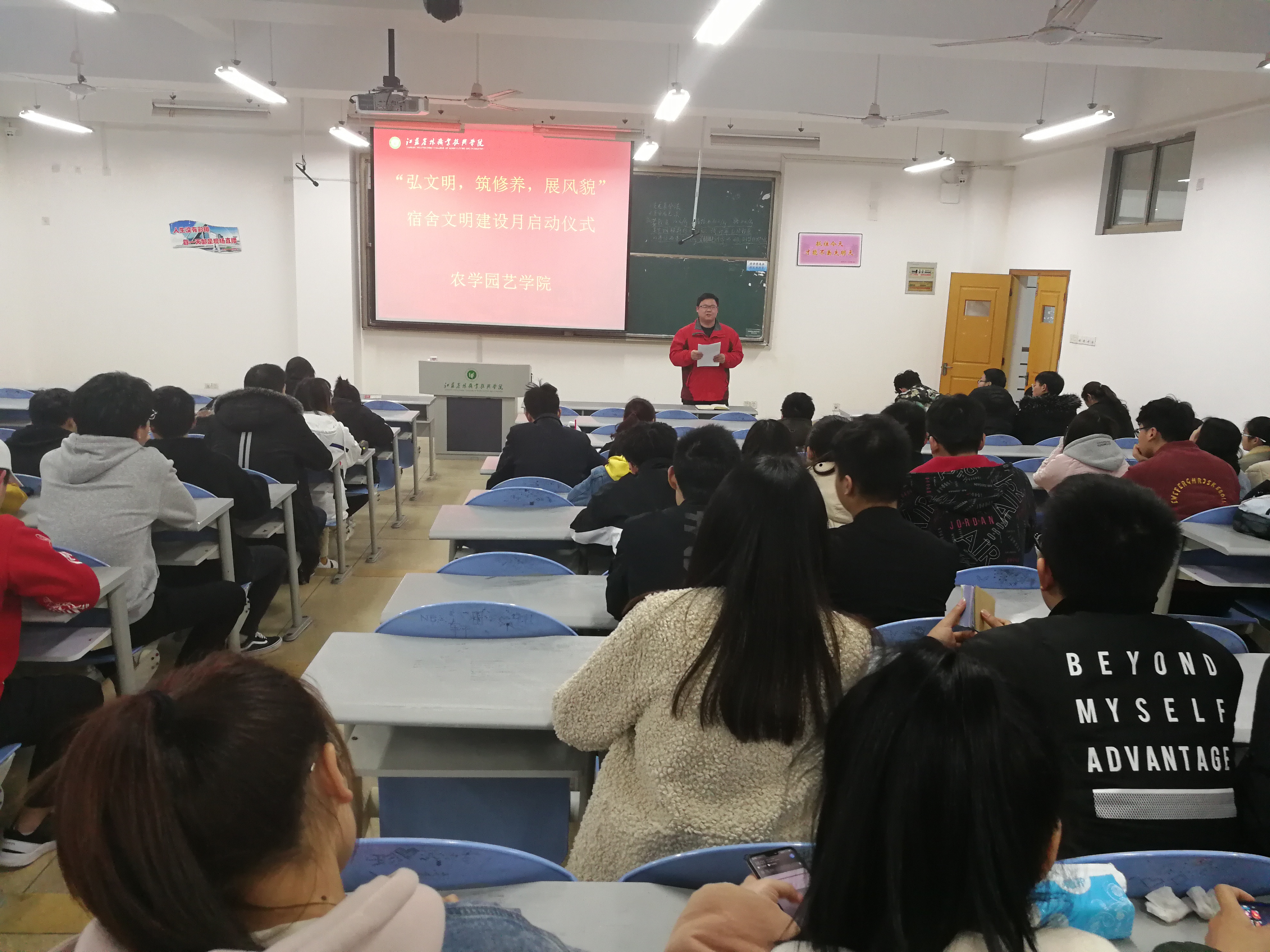 为了推进宿舍文明建设,营造良好的生活环境。2019年3月11日下午农学园艺学院“弘文明,筑修养,展风貌”宿舍文明建设月启动仪式在教学楼J1A205举行。辅导员任小俊老师及全体学生干部参加了启动仪式。