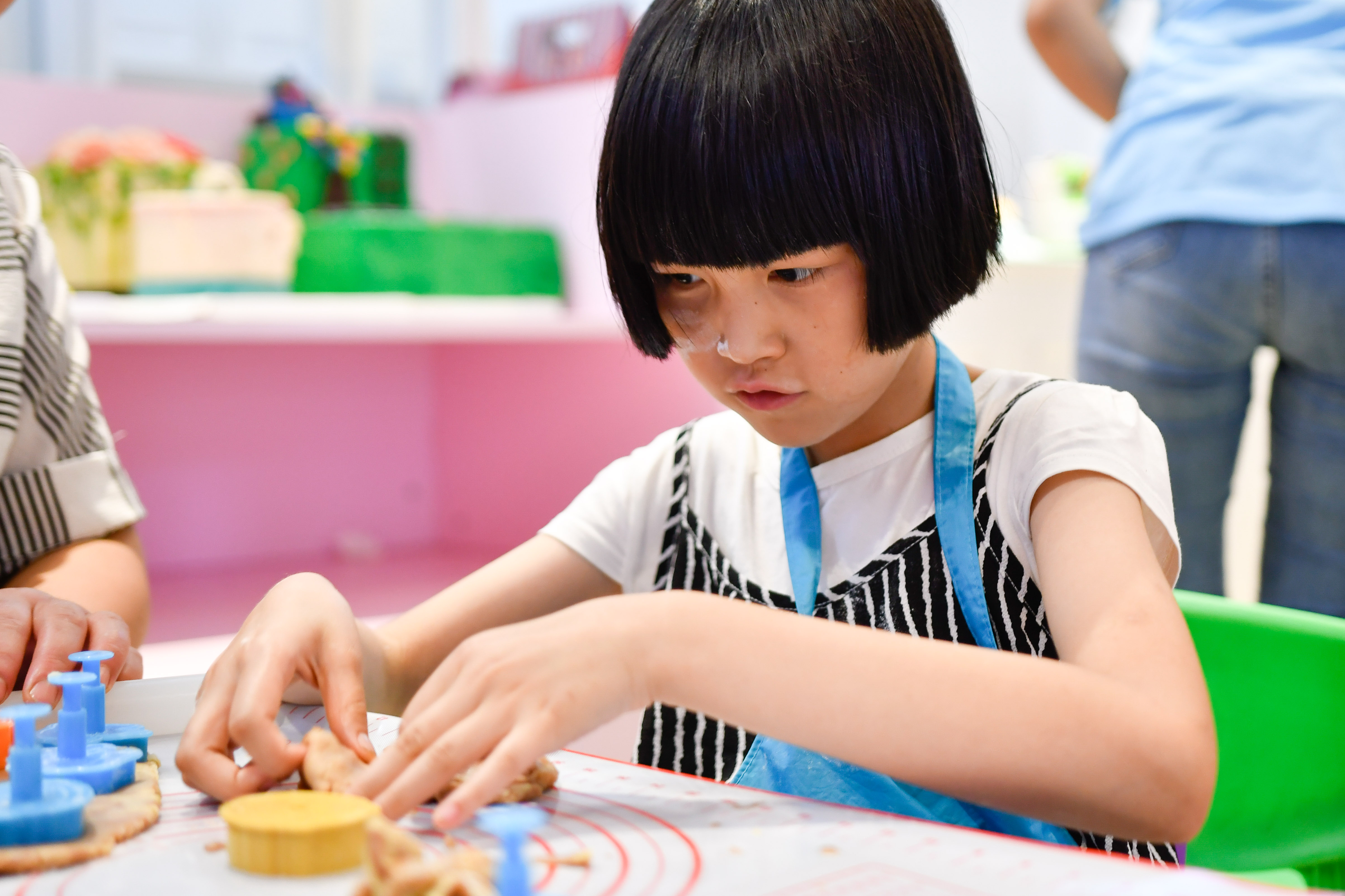 志愿者陪伴着孩子们跟随空气中的一丝甜蜜来到樱妮卡烘焙店。孩子们沉浸在香甜之中无法自拔,烘焙老师将早已准备好的面团和磨具拿给孩子们,随后详细地讲解了制作创意饼干的步骤。志愿者帮助孩子们穿上围裙,清洗双手,按着老师的讲解开始尝试。撒粉、揉面、擀匀、按压磨具,孩子们就像是魔法师,蝴蝶、树叶、花朵、兔子一个个活灵活现的可爱饼干被他们创造出来。看着满满一盆的“艺术品”,孩子们像创造了整个世界,开心得欢呼雀跃。在烤制过程中,志愿者带着孩子去寻找了一番快乐,抓娃娃,打电玩,看机器人,他们让整个商场都活泼起来。回来后香喷喷的饼干已出炉,他们拿着饼干与妈妈、奶奶、志愿者们一起分享自己创造出来的美味。