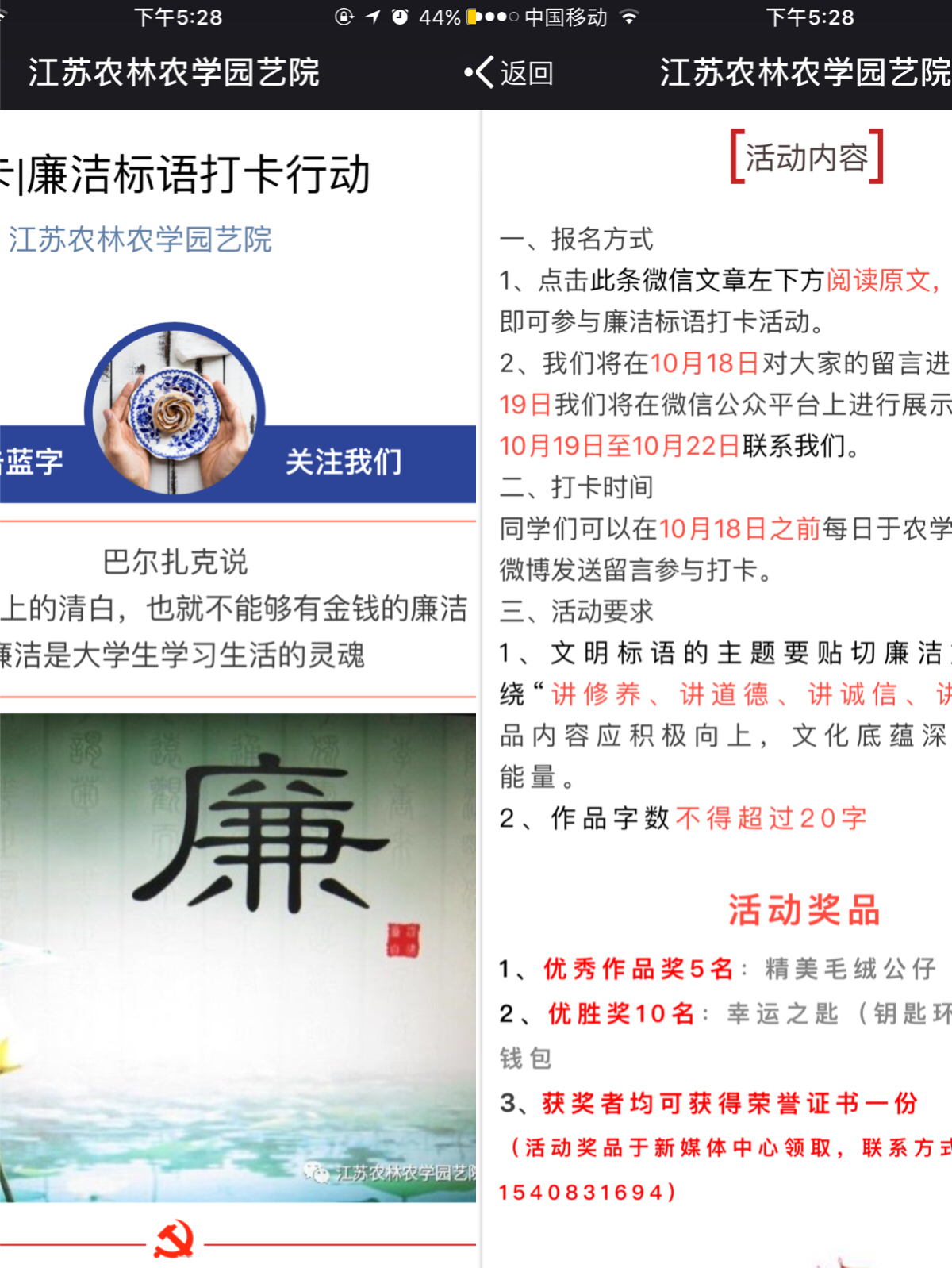 活动伊始,团委在农学园艺学院微信平台公布活动通知,同学们积极参与,在农学园艺学院微博平台打卡,发布评论,大家热情参与,纷纷表达了自己对廉政的独特认识,活动最终评选出二十名同学获得此次活动的优胜奖。