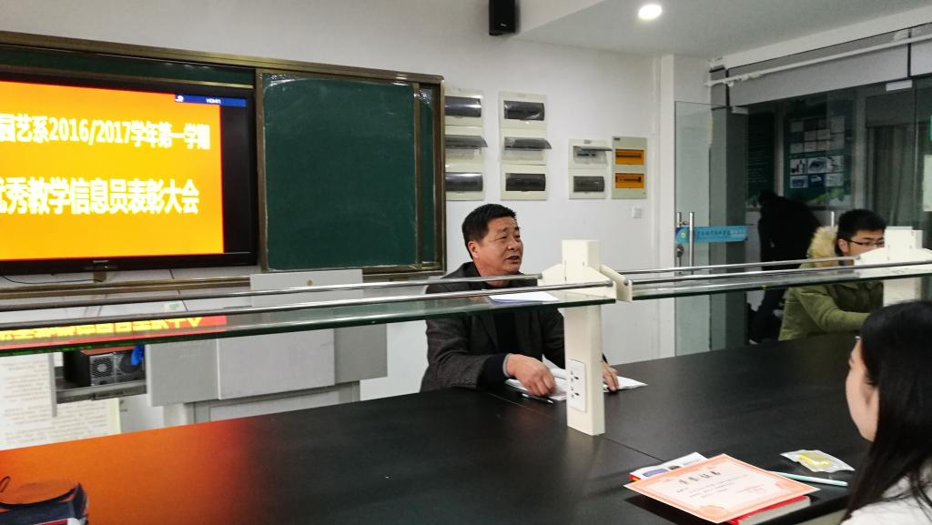 会上,系办刘艳老师宣读了农学园艺系《关于对2016/2017学年第一学期优秀教学信息员表彰的决定》,并由系督导仲吉民老师为获奖的同学颁发了荣誉证书。仲老师对信息员的辛苦工作表示感谢,希望信息员同学要积极参与教学研讨、做好各方的沟通桥梁、在工作学习过程中不断总结提高,继续为我系教学质量的提高做出更大的贡献。最后,仲吉民老师针对近期工作中的问题对信息员工作注意事项进行了明确。