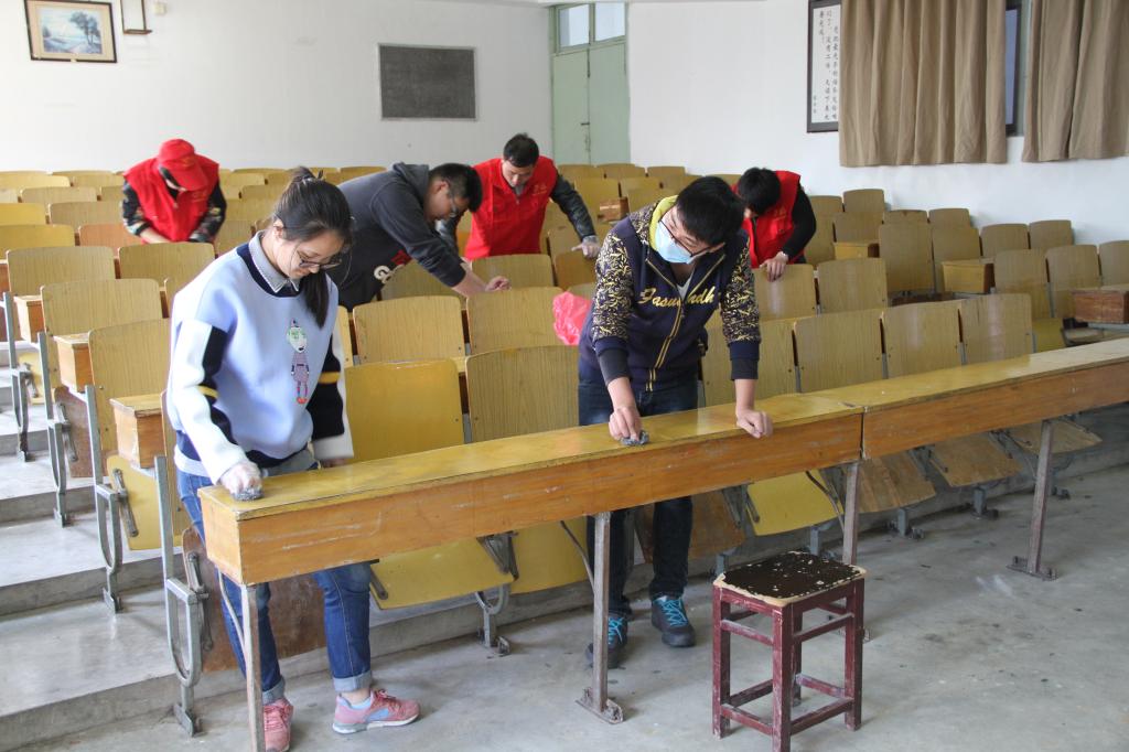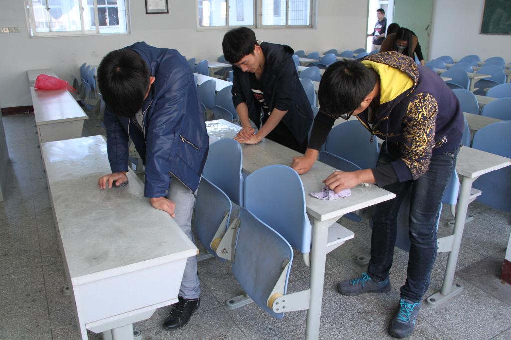 经过精心的准备,细致的分工,志愿者们井然有序地打扫着教室。大家挽起袖口,努力把桌面的涂鸦擦去,将桌椅整齐排列。过程虽然辛苦,但大家仍无怨无悔,只为给同学们留下明、净、美的学习环境。
