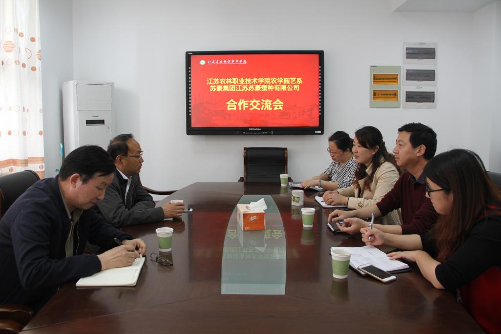 2016年4月15日,农学园艺系与苏豪集团江苏苏豪蚕种有限公司在研发楼会议室开展校企合作交流会,江苏苏豪国际集团股份有限公司副总经理曾万仲、江苏苏豪蚕种有限公司总经理贾仲伟、农学园艺系副主任杨宝林、党总支副书记董慧及相关教师出席了会议。