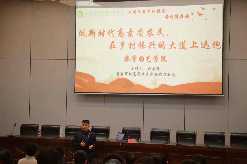 12月15日晚,农学园艺学院在研发楼报告厅开展了“大国三农系列讲座之劳模进校园”活动,邀请了句容市白兔镇葡萄种植示范党支部书记、致富果业专业合作社、江苏省劳动模范张奎峰同志为同学作“做新时代高素质农民,在乡村振兴的大道上迅跑”的专题报告,农学园艺学院21级定制村干班120余名同学参加了活动。