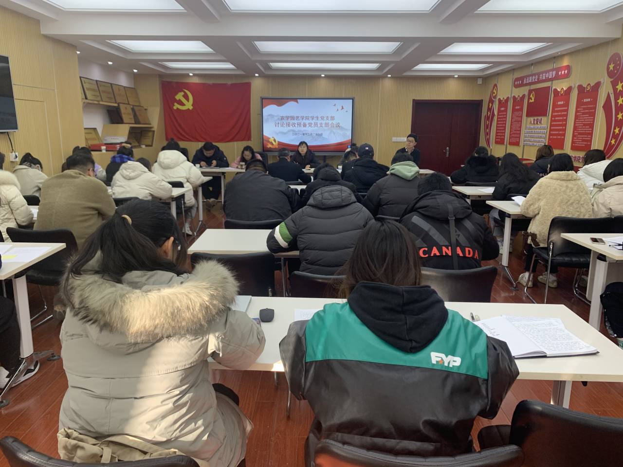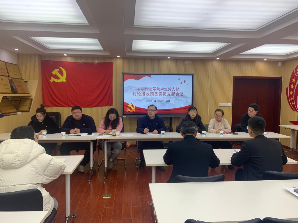 2021年12月28日,农学园艺学院学生党支部在研发楼二楼党员活动室召开接收预备党员支部大会,讨论并表决司荣荣等29名同志能否吸收为预备党员事宜。学生党支部8名正式党员,以及全体预备党员、发展对象参加了此次会议。会议由支部书记嵇怡主持。