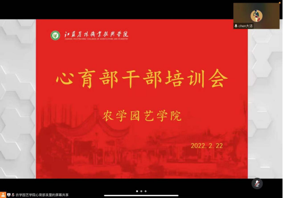 为了贯彻大学生心理健康教育,确保心理教育工作有序展开,农学园艺学院心育部于2022年2月22日晚7:00,在腾讯会议开展农学园艺学院心育部干部培训。培训由陈洁老师主持,学院全体心育委员参加。