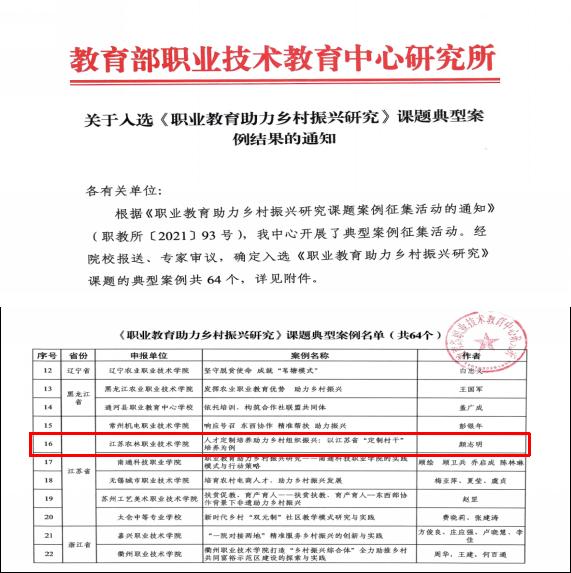 根据教育部职业技术教育中心研究所发布的《关于入选“职业教育助力乡村振兴”课题典型案例结果的通知》,我院《人才定制培养助力乡村组织振兴:以江苏省“定制村干”培养为例》入选课题典型案例。