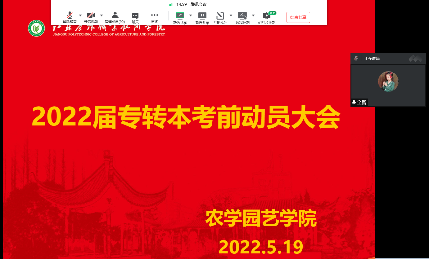 5月19日晚,农学园艺学院通过腾讯会议举行了2022届毕业生专转本考前动员大会,大会由农学园艺学院党总支副书记王全智主持,相关辅导及130名专转本考试的学生参加了会议。