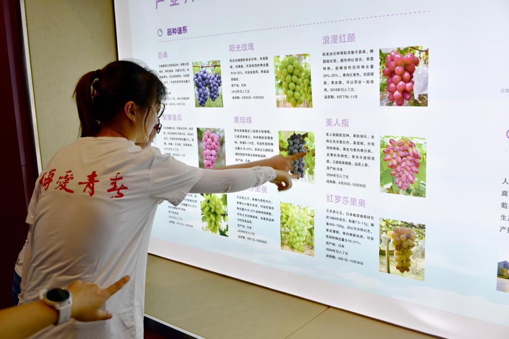 志愿者带领孩子们及家长们首先来到了丁庄葡萄园展览馆,展馆工作人员向大家详细介绍了丁庄葡萄的发展历程以及各品种葡萄相关知识。展馆里满目琳琅的葡萄产品摆在孩子们面前,孩子们都露出了兴奋的表情。随后,大家又跟随工作人员来到葡萄大棚,看到一串串葡萄挂在棚里,孩子们忍不住伸出手摸一摸、闻一闻,拥抱大自然,感受大自然。