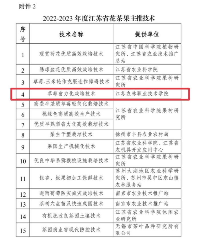 近日,江苏省农业技术推广总站下发了《关于发布2022-2023年度全省花果茶主推品种、主推技术和主推模式的通知》,学院申报的“草莓省力化栽培技术”获得2022-2023年度江苏省花果茶主推技术。