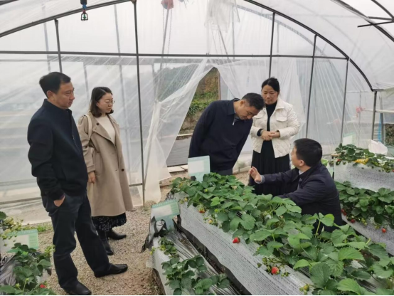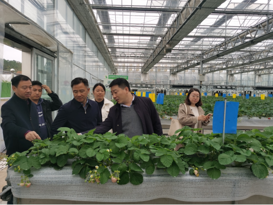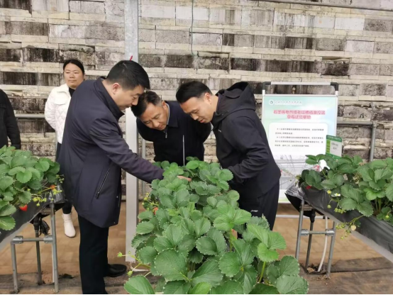 在草莓基地核心示范区,颜志明向潘永圣介绍了基地脱毒种苗繁育及夜冷育苗技术、集成配套自主研发的装配式省力化栽培技术,以及基地推广的超高垄(石棉瓦)栽培模式在句容白兔镇、溧水区傅家边等江苏草莓主产区示范推广应用情况。2021年度苏省现代农业重点研发计划—“石墨烯电热膜设施种养殖精准智能控温技术研究”项目负责人李刚向潘永圣汇报了基地试验使用的石墨烯栽培槽和石墨烯电热线布置及使用情况,以及石墨烯目前在江苏各地区试验开展情况。