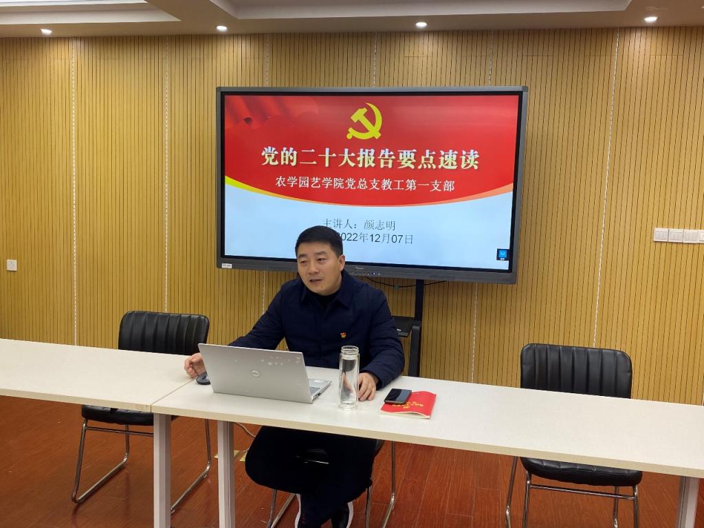 为全面准确领会党的二十大精神,12月7日下午,学院教工第一党支部举行党的二十大精神专题学习会,学院党委委员、农学园艺学院党总支副书记、院长颜志明围绕深入学习宣传贯彻落实党的二十大精神为支部党员讲授专题党课。
