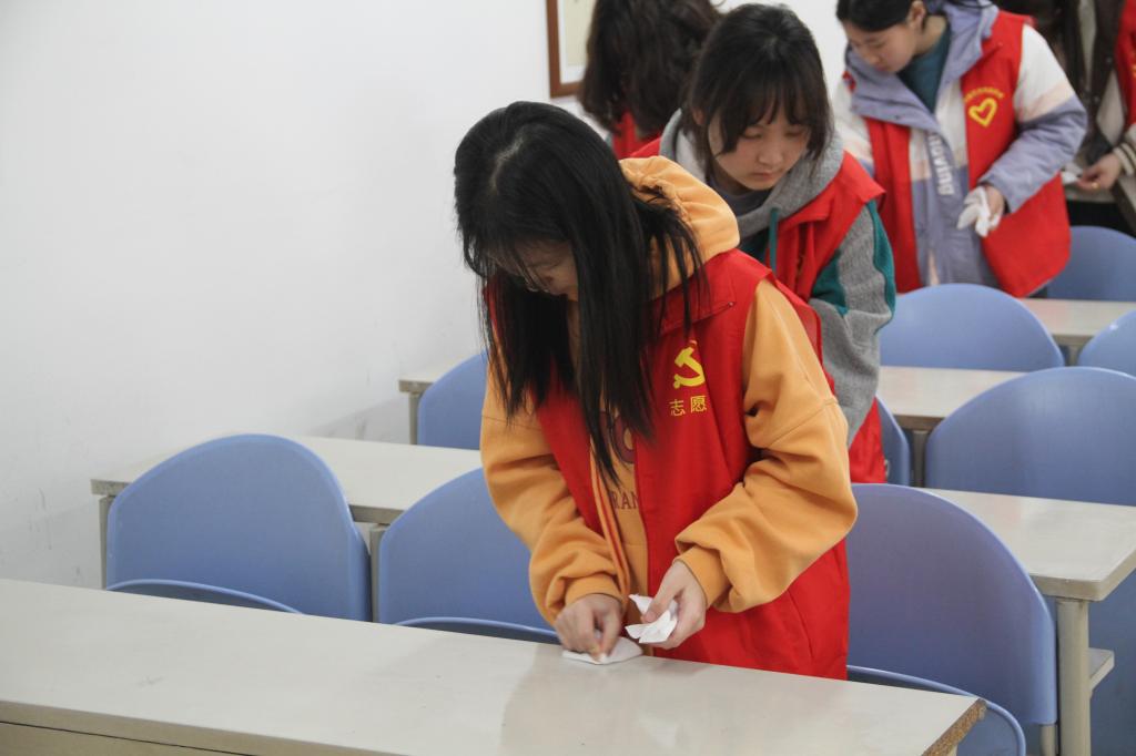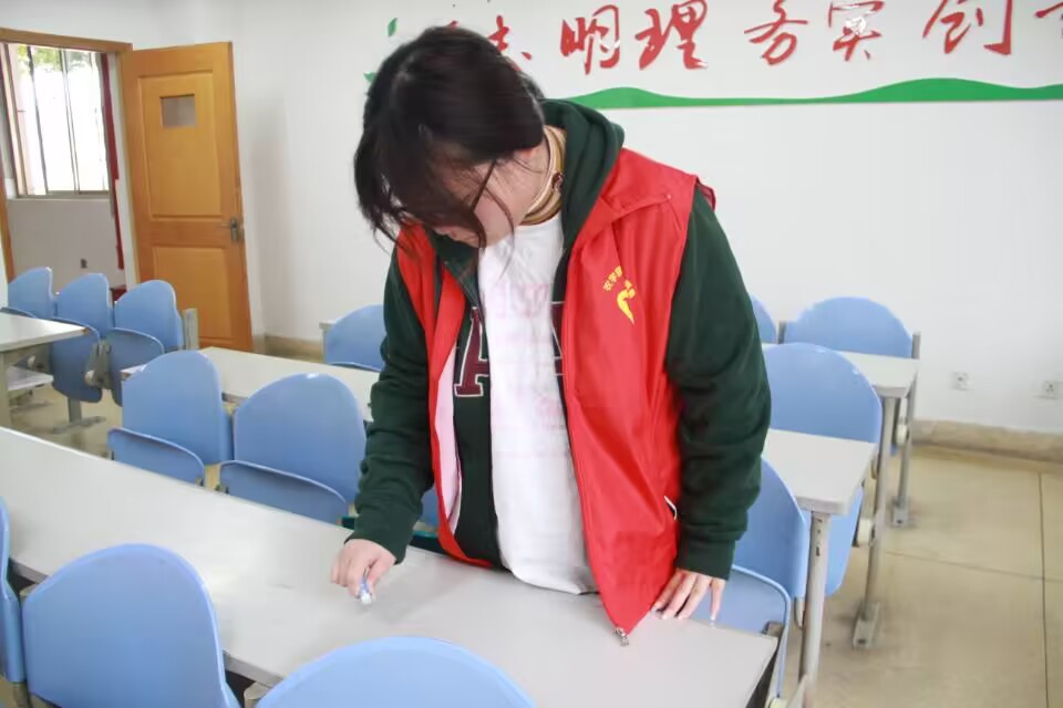 活动中各志愿者主要是打扫教学楼a、b两楼,清理捡取屉子里面和桌面上面的垃圾,擦洗讲台、桌子和黑板,摆放桌椅和各种工具,让教室里面变得干净整洁。在劳动过程中,志愿者们分工明确,各司其职,积极热情地参与清扫工作,不放过任何一个卫生死角,秉承着不怕苦、不怕脏、不怕累的精神,对卫生死角进行了集中清扫,很快把教室打扫的焕然一新、整洁明亮。