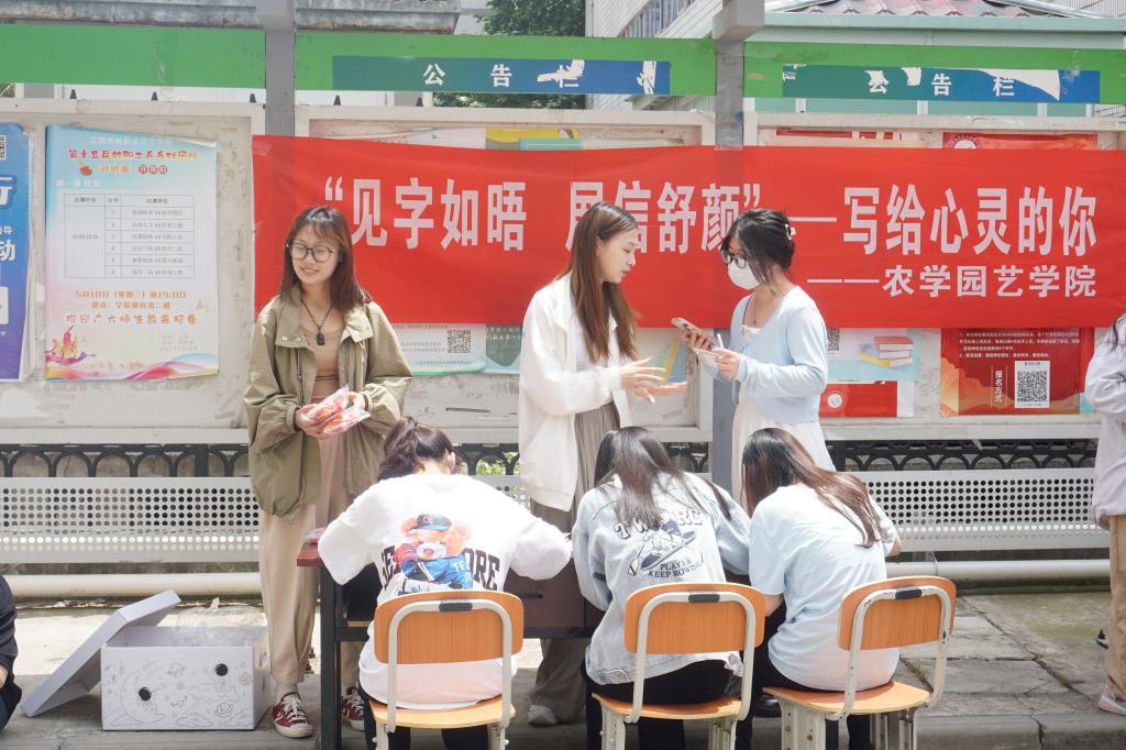 为了让同学们重温书信文化,抒发自我感情,5月19日中午,农学园艺学院心育部在农林食堂门前开展了“见字如晤,展信舒颜——写给心灵的你”主题书信活动,吸引了百余名同学参与。