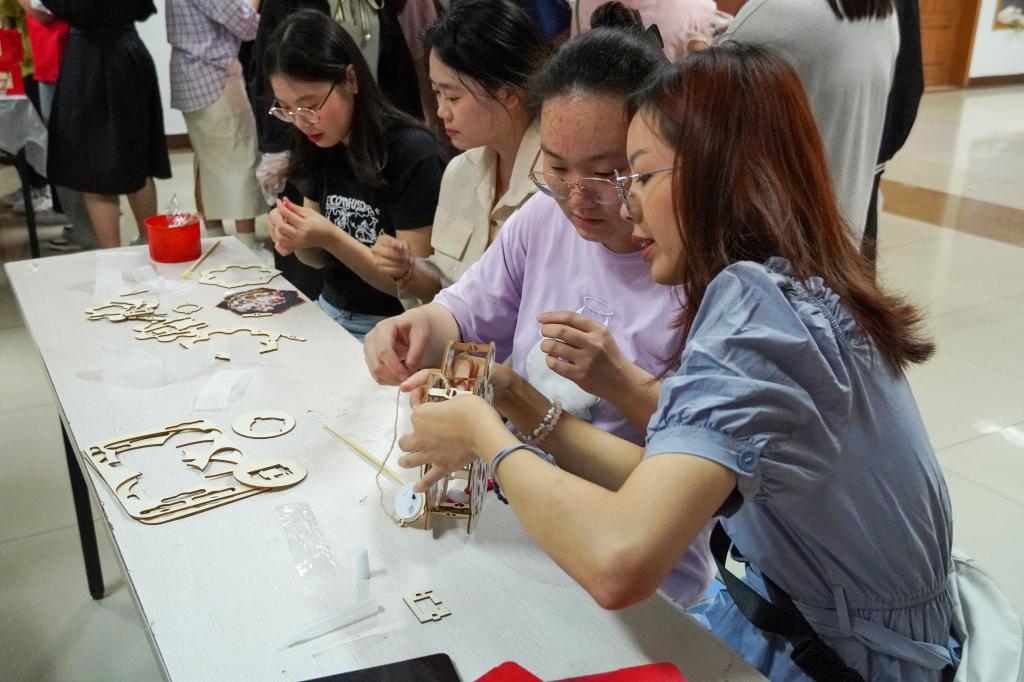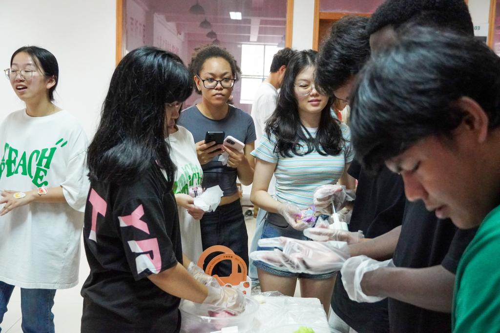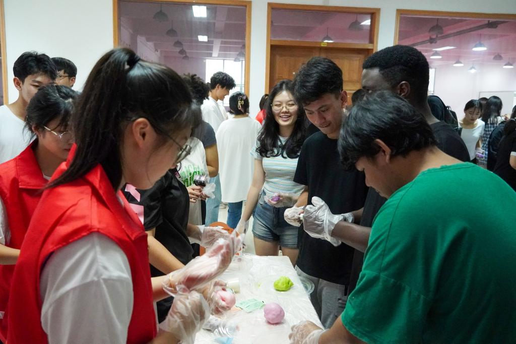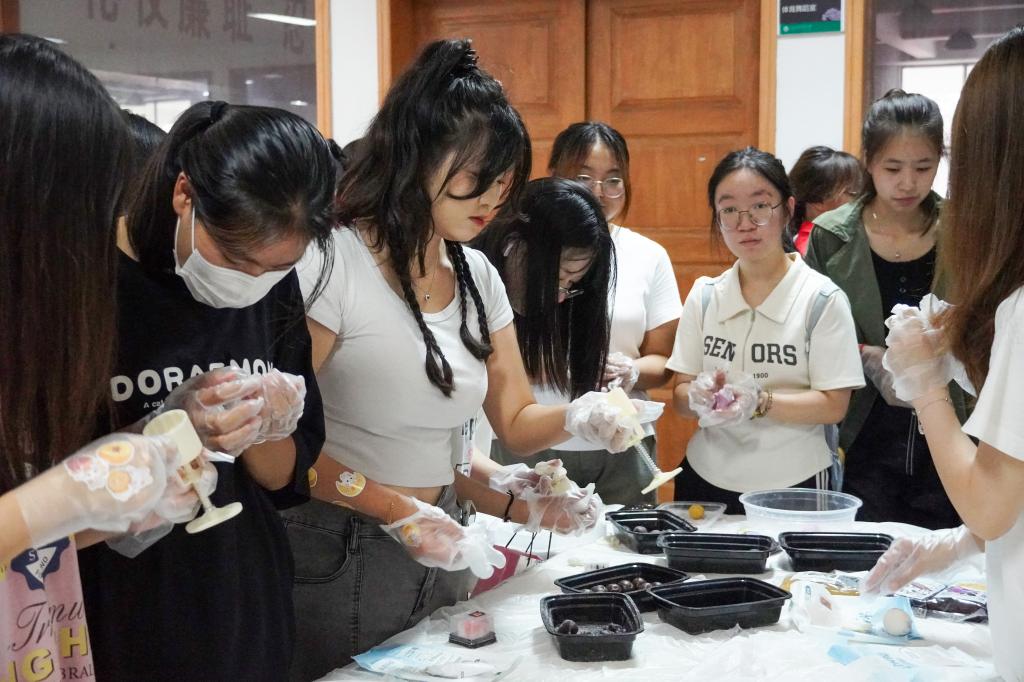 现场分为“快乐月饼蹲”、“中秋百问”、“诗词飞花令”、“团圆‘食’刻冰皮月饼DIY”4个活动区。同学们通过参加“快乐月饼蹲”、“中秋百问”、“诗词飞花令”三个小游戏获得贴纸来换取制作花灯和月饼的材料并在“团圆‘食’刻处与志愿者合作制作月饼。在活动中还邀请园艺技术专业留学生与同学们一起欢度中秋,体验中国传统文化。在月饼制作过程中,留学生和同学们欢聚一堂,沉浸式体验了中国传统文化。