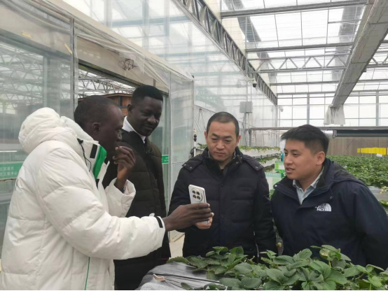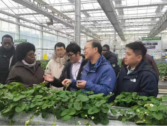 乌干达科技部部长等人现场参观学习了我院自行研发的草莓超高垄栽培、高架栽培、夜冷育苗、温光调控、绿色防控等技术,了解了我国草莓先进的栽培技术。王全智老师从新品种展示、新技术开发、技术推广模式等全方面为学员们讲解了农博园草莓基地的做法,来访人员对我院草莓的栽培技术及推广模式非常感兴趣,并表示要把我院的草莓研究成果引入他们的国家。