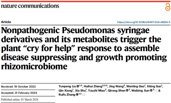 近日,《自然·通讯》(Nature Communications)(IF=16.6)在线发表了农学园艺学院张慧慧博士完成的最新研究成果(Nonpathogenic Pseudomonas syringae derivatives and its metabolites trigger the plant “cry for help” response to assemble disease suppressing and growth promoting rhizomicrobiome),该成果是由南京农业大学张瑞福教授课题组、中国农业科学院农业资源与农业区划研究所和江苏农林职业技术学院合作完成。