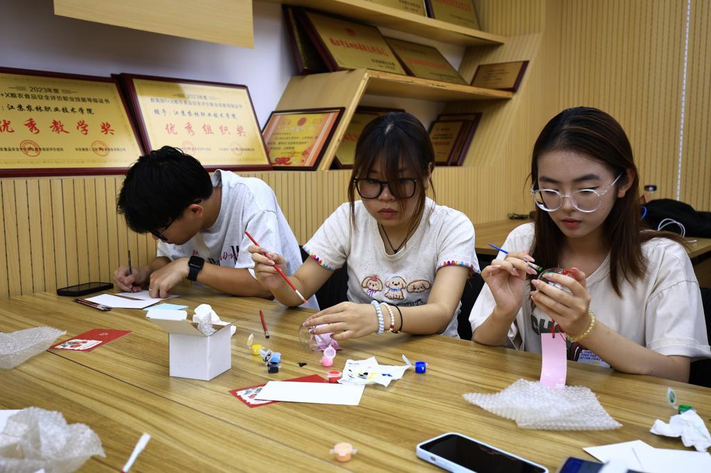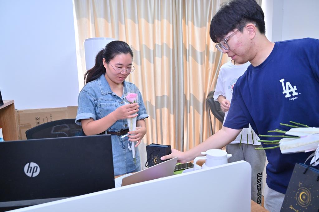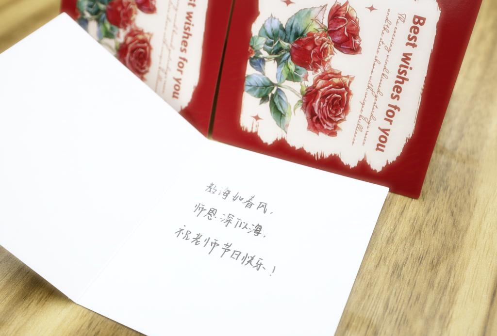 巧手制作敬师恩,诗韵三行谢吾师。9日晚,同学们在研发楼二楼党建活动室,通过涂画风铃、绘制贺卡、撰写短诗等方式表达了自己对老师独特的节日祝福与感谢。活动最后,大家在心愿打卡展板上留下“亲爱的老师,我想对你说……”,用一颗真心渲染爱意,用一句祝福深情告白。10日上午,同学们给老师们赠送了节日鲜花与纪念礼品,老师们驻足心愿打卡展板阅读同学们留下的张张祝福留言,大家纷纷拍照合影留念,共同庆祝这个属于自己的节日。
