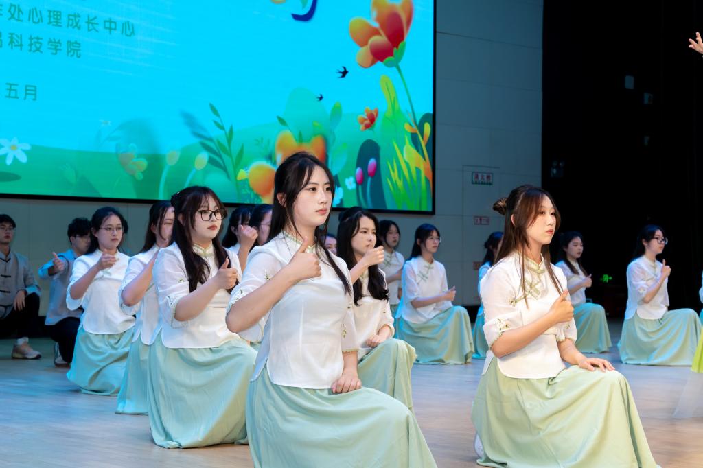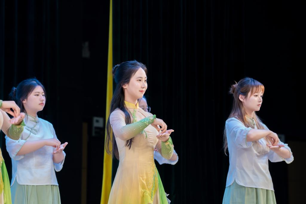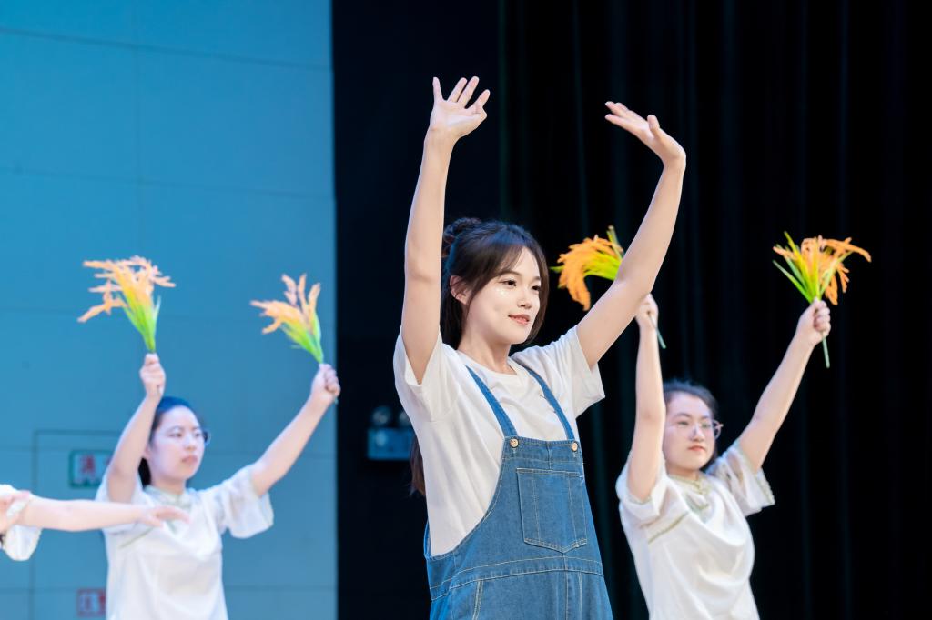 舞台光影中,40名学生以指尖为笔,绘就生命的蓬勃画卷。《种子》篇章中,蜷曲的身躯如胚芽苏醒,整齐划一的手语化作破土而出的力量;《芽》的旋律里,绿绸翻涌成稻浪,舞者以肢体演绎雷电中的倔强生长;终章《稻香》则以金色稻穗为媒,丰收的喜悦在舒展的手势间流淌。从静默萌芽到穗浪千重,表演者将自然韵律与心灵语言深度融合,评委盛赞其“用无声胜有声的艺术,诠释了生命教育的真谛"。