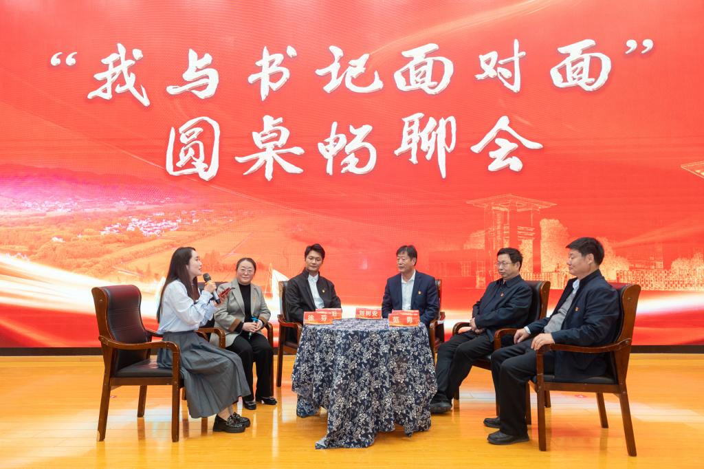 第五环节“我与书记面对面”圆桌畅聊会。五位村书记结合村庄发展实际,分享了“党建引领集体经济发展”的鲜活案例:西冯村徐芬介绍因地制宜发展草坪产业,通过协议补偿、修路解决运输难题,实现全国销售;丁庄村吴阳揭秘葡萄产业“破圈”路,引进品种对接市场;唐陵村刘树安讲述贫困村变亿元村历程,多维度拓展致富;白兔村杭玉巧聚焦产品价格,鼓励新农人创业;永兴村范勇分享苗木产业规划,强调读懂政策、珍惜机遇实现致富。