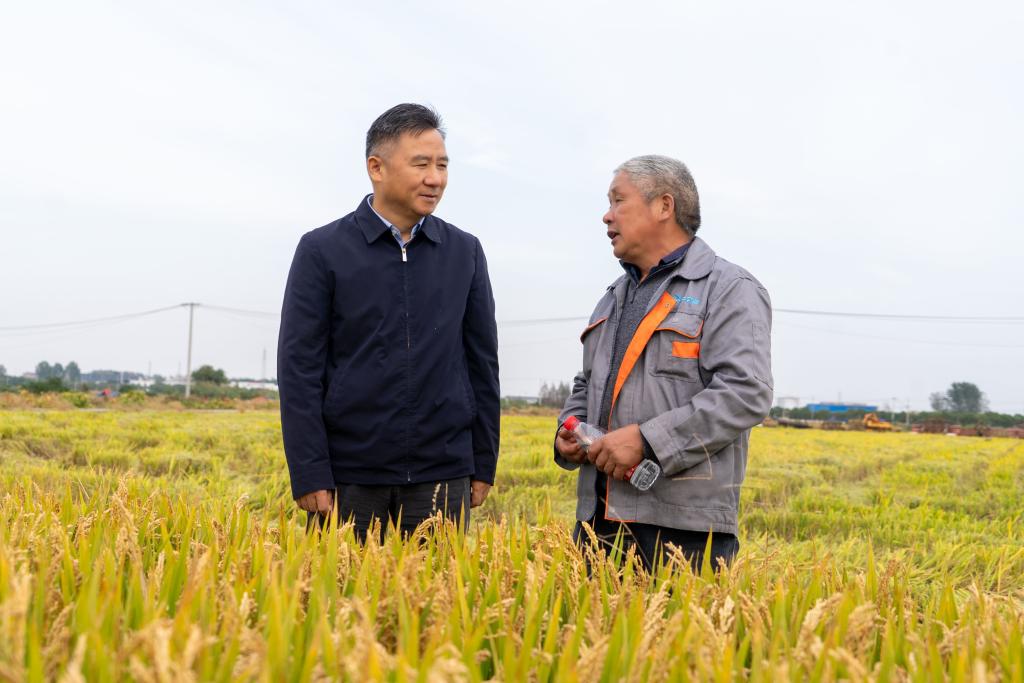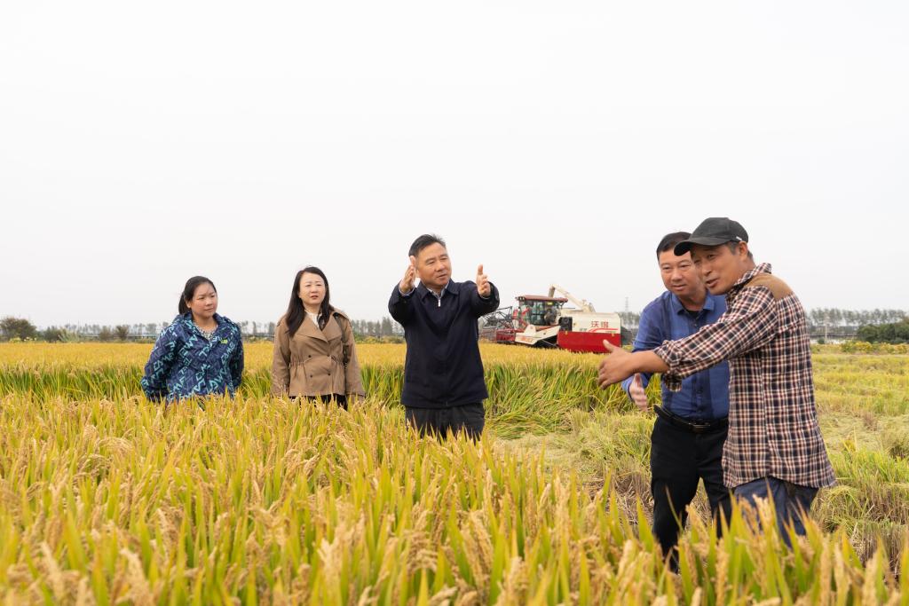 2025年10月29日下午,学院党委副书记、院长兼江苏省作物学会理事长潘永圣,与学会秘书长杨宝林带领新禾粮食单产提升科技服务团专家团队,奔赴丹阳水稻种植区开展测产工作。