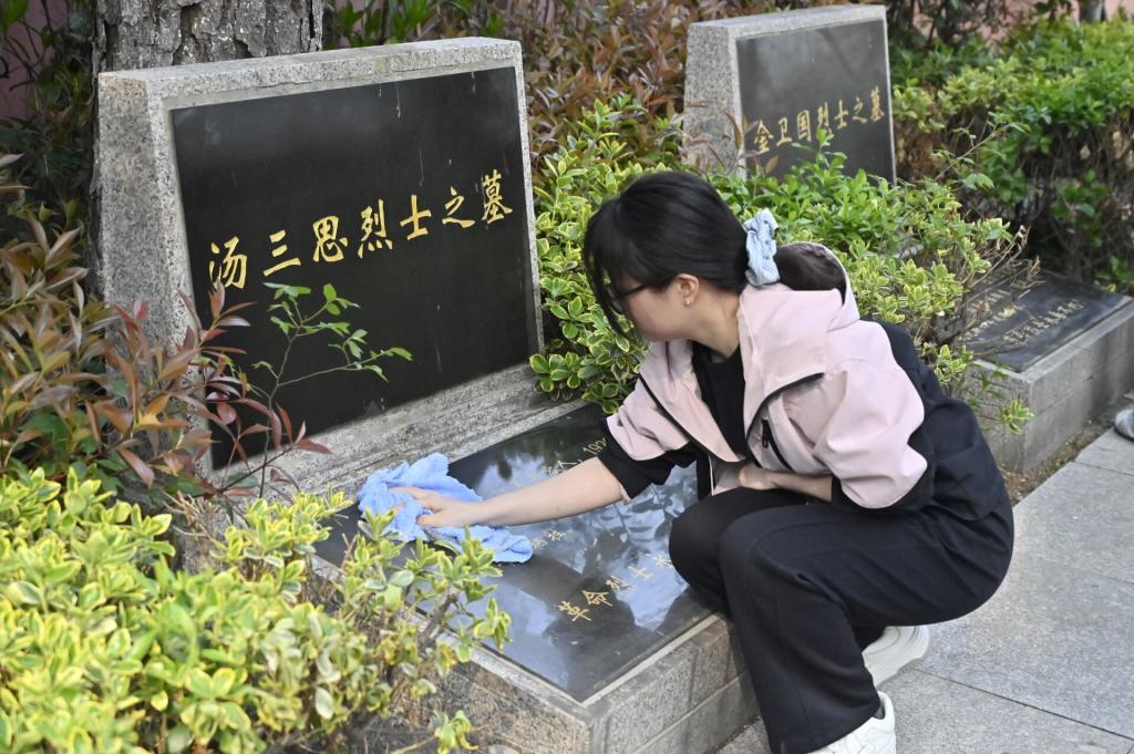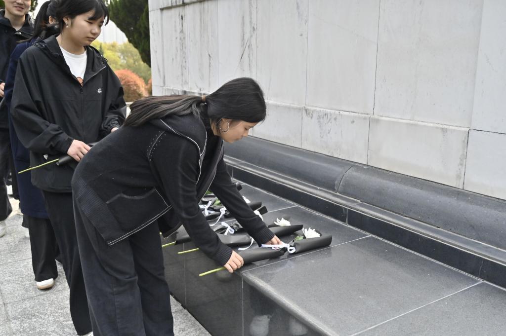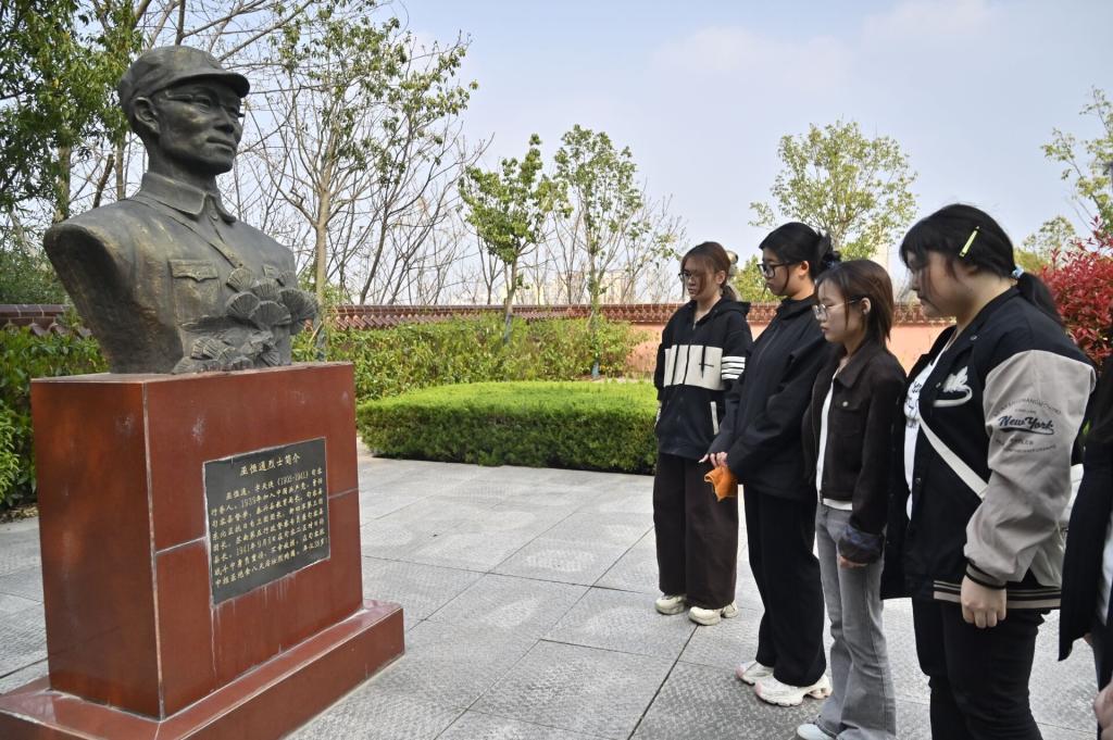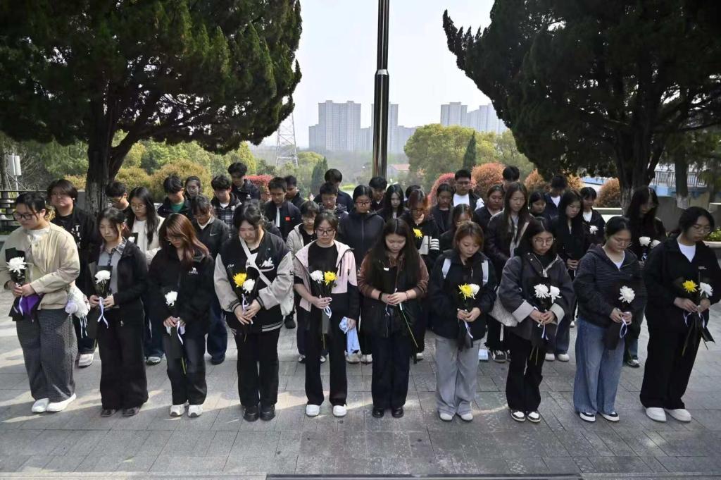 活动当天,同学们身着深色整洁服装,手持菊花列队。在烈士纪念碑前,全体学生肃立默哀,向为民族解放英勇献身的革命先烈致以崇高的敬意。默哀毕,全体同学绕着纪念碑缓步上前敬献鲜花,接着同学们擦拭烈士墓碑来表达深切缅怀。随后,大家走进烈士纪念馆,观看革命先辈浴血奋战的事迹,每一段故事都让在场同学深受触动。